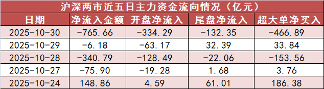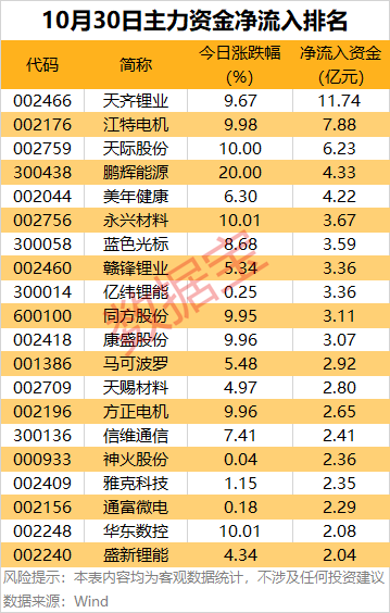 电子、通信行业主力资金净流出金额均超百亿元。 A股三大指数今日(10月30日)集体回调,沪指失守4000点大关,行业板块多数收跌,能源金属板块大涨,钢铁行业、电池板块涨幅居前;游戏、电源设备、电子化学品、煤炭行业、证券、农药兽药、电子元件板块跌幅居前。 从今日主力资金情况来看,沪深两市全天主力资金净流出765.66亿元。仅交通运输、纺织服饰2个行业主力资金净流入,金额分别为9497.05万元、9287.6万元。 29个主力资金净流出行业中,电子、通信行业主力资金净流出金额居前,金额分别为154.64亿元、110.08亿元;计算机、电力设备、机械设备、非银金融行业主力资金净流出金额均超50亿元;汽车、医药生物、国防军工行业主力资金净流出金额均超30亿元。 11股获主力资金净流入均超3亿元 据证券时报·数据宝统计,从个股来看,58股主力资金净流入均超1亿元,其中11股获主力资金净流入均超3亿元。 有色金属龙头天齐锂业主力资金净流入11.74亿元,居首。受美联储降息等利好提振,有色板块再度冲高,天齐锂业盘中涨停。昨日晚间,公司发布三季报,尽管前三季度营收同比下降26.5%至74亿元,归母净利润却实现同比增长103.16%至1.80亿元,主因锂矿定价周期缩短缓解了成本错配,叠加SQM投资收益大幅回升及澳元升值带来汇兑收益。 江特电机主力资金净流入7.88亿元,居次席。该股今日涨停,龙虎榜数据显示,上榜营业部席位全天成交8.78亿元,合计净买入2.77亿元。具体来看,深股通专用、国泰海通证券上海浦东新区海阳西路证券营业部分别净买入1.26亿元、8214.15万元。