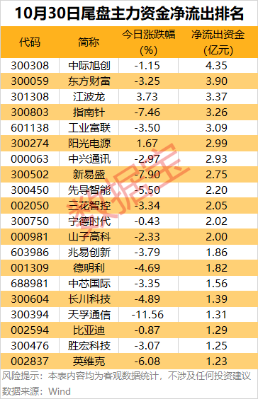 尾盘主力资金净流出方面,中际旭创、东方财富、江波龙、指南针、工业富联尾盘主力资金净流出均超3亿元;阳光电源、中兴通讯、新易盛、先导智能等尾盘主力资金净流出均超2亿元。