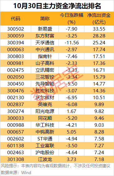 今日有51股主力资金净流出均超3亿元,其中,新易盛、东方财富、天孚通信、中兴通讯、指南针、山子高科、立讯精密等热门股净流出金额均超10亿元。