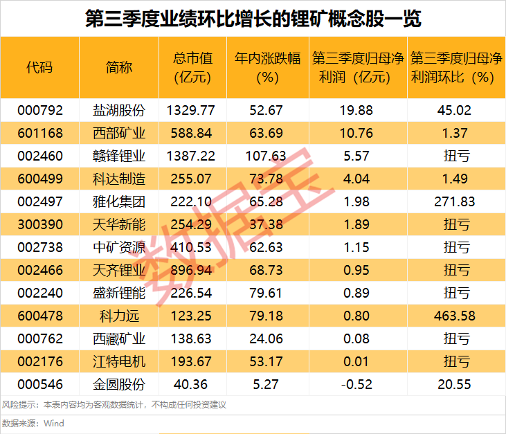 消息面上,广期所碳酸锂主力合约早盘一度涨超3%,逼近85000元/吨。此外,中国有色金属工业协会副秘书长林如海在2025年前三季度有色金属工业经济运行情况新闻发布会上介绍,我国碳酸锂、氢氧化锂等基础锂盐,金属锂及其合金、锂离子电池正极材料、电解质等产品的产量连续多年位居全球第一。 国泰海通证券认为,强劲需求支撑,去库预期推动锂价上行。供应方面,锂辉石端和盐湖端均有新产线投产,市场供应稳步增加,锂盐厂开工率维持高位。需求方面,主力下游表现依然强劲,动力电池快速增长、储能市场供需两旺,下游料厂开工率持续走高对现货成交形成支撑。 锂矿概念股 第三季度业绩显著回暖 据证券时报·数据宝统计,锂矿概念股年内股价平均上涨50.81%,藏格矿业、赣锋锂业年内股价涨幅翻倍,分别上涨121.19%、107.63%,盛新锂能、科力远、科达制造等涨幅居前。 中矿资源10月以来获得185家机构调研。公司表示,2025年6月,为进一步降低锂盐业务生产成本,加速推进绿色低碳发展模式,江西中矿锂业对年产2.5万吨锂盐生产线进行综合技术升级改造,投资建设年产3万吨高纯锂盐技改项目,预计停产检修及技改时间为6个月。项目建成投产后,公司将合计拥有418万吨/年锂矿处理能力和7.1万吨/年电池级锂盐产能。 藏格矿业月内获得82家机构调研。前三季度,公司实现碳酸锂产量6021吨,销量4800吨,平均含税售价6.73万元/吨,平均销售成本4.09万元/吨,毛利率31.20%。藏格锂业已于2025年10月11日正式恢复生产,结合2025年剩余有效生产时间,本着审慎原则,公司对全年产销计划进行了优化调整,将全年产量、销量均由原计划的11000吨调整至8510吨,分别调减2490吨。后续公司将科学组织生产,全力完成调整后的年度产销目标。 从业绩数据来看,目前19只概念股发布前三季度业绩报告,天齐锂业、西藏矿业、赣锋锂业、中矿资源等7股第三季度单季净利润环比实现扭亏,科力远、雅化集团的单季度业绩环比增幅分别高达463.58%和271.83%。 整体来看,第三季度业绩环比增长的锂矿概念股数量显著多于业绩环比下降的个股,这说明锂矿公司业绩显著回暖。 展望后市,南华期货预计,2025年第四季度碳酸锂价格将在6.8万元/吨至7.5万元/吨区间内震荡运行。但需重点关注两大核心变量:一是国内盐湖提锂、锂云母等供给增量的实际释放节奏;二是下游电芯需求是否出现超预期变化,这两大因素将共同决定价格运行重心;整体来看,季度内价格大概率维持平稳态势。