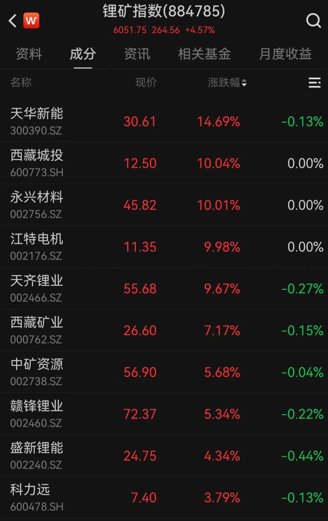 锂矿概念股拉升 锂矿概念股午后拉升,西藏城投、永兴材料、江特电机涨停,天齐锂业一度涨停,西藏矿业、中矿资源、赣锋锂业涨幅居前。