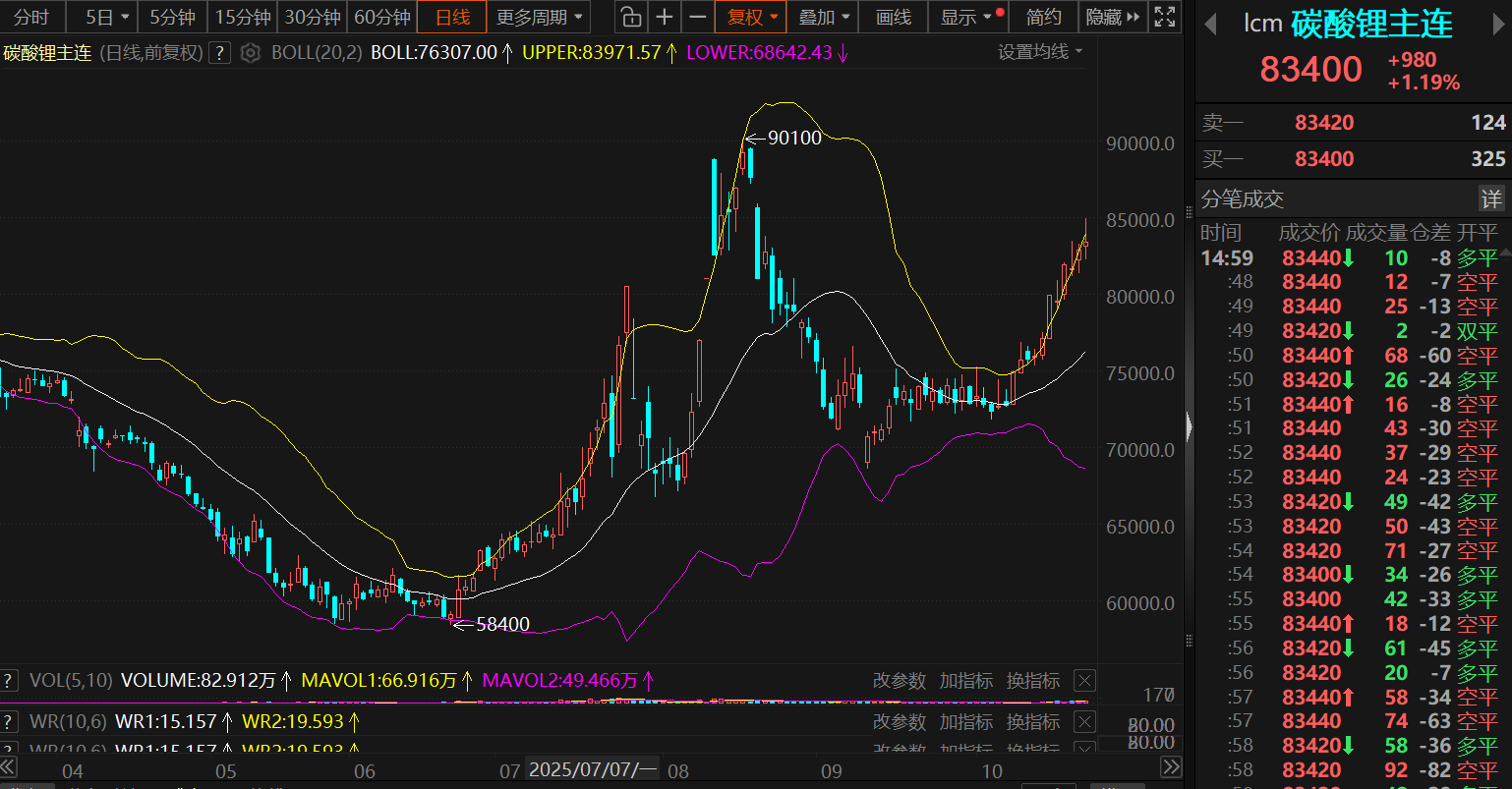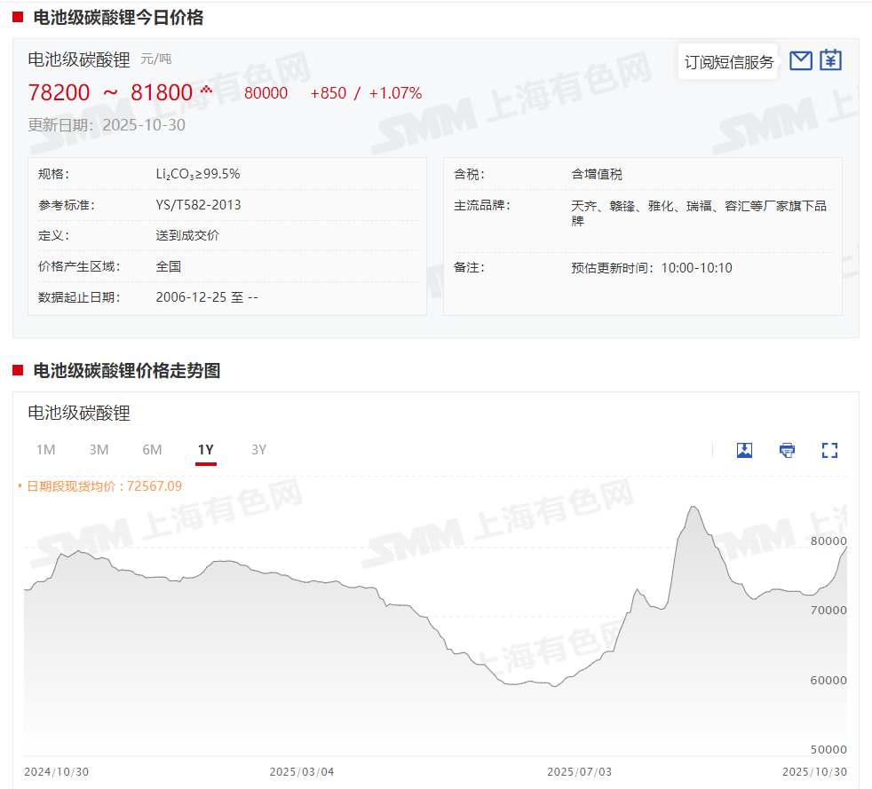 》点击查看SMM新能源产品现货报价 9月碳酸锂价格环比出现小幅回落,虽然下游迎来需求旺季,且当月供应总量低于旺盛的需求,导致碳酸锂市场形成明显的去库格局,但因供需缺口主要通过消耗前期社会累计库存来满足,因此并未对即期供应造成实质性压力。叠加8月价格急涨后的技术性回调需求,共同推动市场看涨情绪降温,9月电池级碳酸锂月度均价回落至7.41万元/吨。 进入10月份,下游需求持续向好,动力市场新能源汽车商用乘用同时快速增长,储能市场供需两旺,强劲的需求持续消耗市场库存,对碳酸锂价格形成支撑。 截至10月30日,电池级碳酸锂现货报价涨至7.82~8.18万元/吨,均价已经成功站上8万元/吨的整数关口,较此前的年底低点5.99万元/吨上涨2.01万元/吨,涨幅达33.55%。 据SMM最新了解,当前碳酸锂供应端维持高位运行,锂辉石与盐湖工艺开工率均保持在60%以上,预计10月总产量有望创下新高。需求侧表现则更为强劲,新能源汽车与储能领域同步增长,持续拉动材料需求,下游材料厂开工率持续走高。尽管锂盐厂在价格上涨过程中存在惜售情绪,导致市场实际成交平淡,但在长协加量以及贸易商囤货的影响下,上游库存已降至低位,市场呈现明显的去库存格局。 综合来看,当前市场呈现供需双增态势,但需求增长更为突出,推动价格连续上行。预计短期内在低库存和强需求支撑下,碳酸锂价格将保持偏强运行。》点击查看详情 而在强劲的需求支撑下,近期碳酸锂期货也持续上涨,截至10月30日,碳酸锂期货主连以1.19%的涨幅报83400元/吨,录得七连涨。