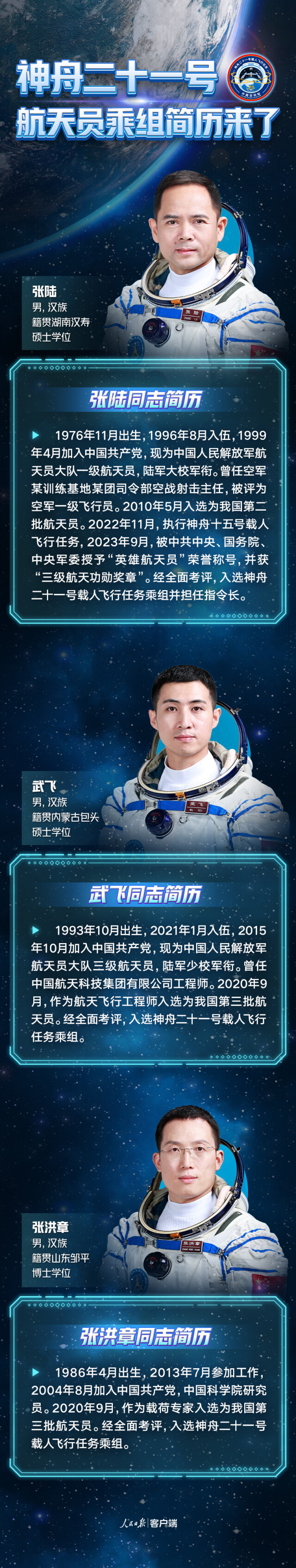 指令长张陆—— 所有训练必须以最优成绩通过 神舟二十一号乘组指令长,是曾圆满完成神舟十五号飞行任务的航天员张陆(见图,新华社记者李志鹏摄)。时隔两年四个月,他将带领两名新队友再度叩问苍穹。 每名执行过任务的航天员,被问最多的问题之一就是:什么时候再飞?张陆深知,作为航天员,要时刻保持准备飞行的状态。神舟十五号任务结束后,他没有丝毫懈怠,重新投入各项强化训练。 “所有训练必须以最优成绩通过。”张陆坦言,年龄增长让体能恢复变慢,因此,他每次训练都会比年轻队友投入更多精力和时间。 针对空间站任务的新特点、新技术、新实验,张陆进行了更深、更细的研究和学习,遇到不懂的问题,就及时向科研人员请教,直到完全掌握。特别是对一些科学实验机柜和新增试验项目,从设计原理、设计理念到操作流程、数据记录等都要熟练掌握。在张陆看来,如果想成为一名合格的指令长,自己必须先“吃透”技术,才能在太空给队友提供准确指导。 张陆认为,神舟二十一号航天员乘组的优势在于:70后的自己有丰富的飞天经验与统筹协调能力,能带领团队应对各类突发情况;90后的武飞年轻有活力,理论与操作能力突出,是技术“尖刀”;80后的张洪章稳重博学,能在专业领域提供支持。 “我们各自的特长能满足任务中的不同需求,这样的组合,让我对执行本次任务充满信心。”张陆说。 问答 问:距离您上次执行神舟十五号载人飞行任务已经过去两年四个月了。这次重返中国空间站,您做了哪些准备? 张陆:自神舟十五号任务结束以来,我一直以“学生”的心态持续投入高强度的训练。这些年,我走进学校,与热爱航天、热爱科学的孩子们分享我的太空经历与航天情怀。他们眼中闪烁着对宇宙的好奇与向往,这也让我一次次感受到航天事业薪火相传的意义。 同时,我也密切关注着空间站的运行状态,关注着每一次出舱活动、每一项科学实验。我最期待的是迎接挑战,再次听到曙光、北京、天宫、银河、天舟等熟悉的呼号。 问:作为一名70后指令长,您即将带领一名80后和一名90后飞向太空,请问这个团队有什么特点? 张陆:90后的武飞曾是一名飞行器环境试验工程师,性格外向,是团队的“活力因子”。在工作中,他总是能够让枯燥的内容变得更加有趣,他那份永远向外“辐射”的热情,让团队在欢声笑语中前行。 80后的张洪章长期从事电化学储能技术研究,性格沉稳,做事踏实。闲暇时,他喜欢种菜、养花、打太极、品读诗词。到了空间站,他可以一边进行科学实验,一边种菜养花、打拳吟诗,把中国空间站变成全宇宙最诗意的“桃花源”。 飞行工程师武飞—— 以前是学深,现在更要学广 神舟二十一号乘组02航天员武飞(见图,新华社记者李志鹏摄),出生于1993年,不仅是我国执行任务最年轻的航天员,也是我国航天员队伍中最年轻的航天员。 2010年填报高考志愿时,武飞选择了北京航空航天大学飞行器设计专业,叩开逐梦航空航天的第一扇门。 怀着报效祖国的初心,武飞进入中国航天科技集团有限公司空间技术研究院工作,参与载人航天、月球与深空探测等多类航天器的研发验证。“参与国之重器建设的自豪感,是什么都换不来的。”武飞说。 头顶星光、日夜兼程的日子里,武飞隐隐期待着:有一天,自己能从守护空间站的工程师,变成入驻空间站的航天员。 机会来了,我国第三批航天员选拔结果公布,武飞赫然在列。与飞行员出身的队友相比,武飞的体能水平存在明显差距。他曾试图“突击训练”,却险些因运动过量导致损伤。后来他调整心态,根据自身情况制定训练计划,从基础动作练起,逐步提升强度。渐渐地,武飞的体能成绩稳步达标。 以前做地面工程师,武飞只需在“航天器热控”领域深耕;成为航天员后,他要掌握热学、力学、空间材料学等多领域知识。“以前是学深,现在更要学广。”武飞争分夺秒,严格要求自己。“假如空间站内出现设备损坏、地面也无法完全判明情况时,航天飞行工程师就可以在故障排查、维修过程中发挥作用,以万无一失的操作配合地面共同解决问题。”武飞说。 问答 问:您是我国目前执行飞行任务最年轻的航天员。这么快就要实现飞天梦想,感受如何? 武飞:作为航天员队伍中最年轻的一员,迎来自己的飞天任务,我深感无比幸运。这份幸运,源于我们正处于一个航天事业跨越式发展的伟大时代——中国空间站已经成为璀璨星河中最闪耀的“太空之家”,源于常态化的天地往返让年轻一代有了更多、更早为国出征的机会,更源于成千上万名科研工作者用智慧和汗水搭建起这座通往星辰大海的“天梯”。 这份幸运于我而言,更是一份如山的责任。我们只有把每一个细节做到极致,才能无愧于为祖国出征太空的崇高使命。 问:作为航天飞行工程师,此次飞行任务中,您的主要工作是什么? 武飞:我的主要职责聚焦于空间站组合体的平台照料与站务管理,以及设备的维护、维修与升级。国家太空实验室承载着无数科研人员的智慧与期待,我的工作就是要确保每一个环节都处于最佳工作状态。在指令长的带领下,在地面团队的支持下,我们有信心克服一切挑战,圆满完成所有既定任务。 载荷专家张洪章—— 在太空完成这些实验,是幸运更是责任 神舟二十一号乘组03航天员张洪章(见图,汪江波摄,新华社发),是我国第二位飞天的载荷专家。