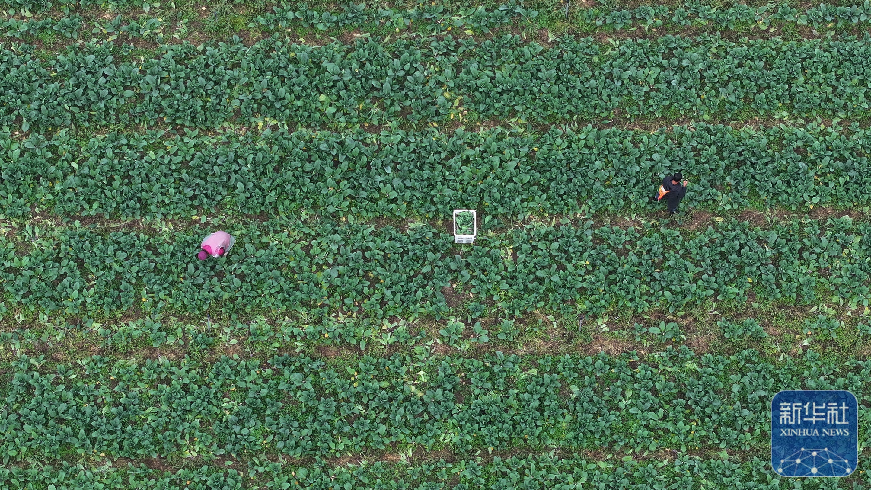 ↑ 10月30日,菜农在沅江市草尾镇乐园村蔬菜田里采收蔬菜(无人机照片)。