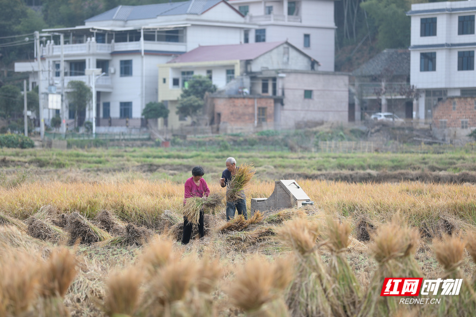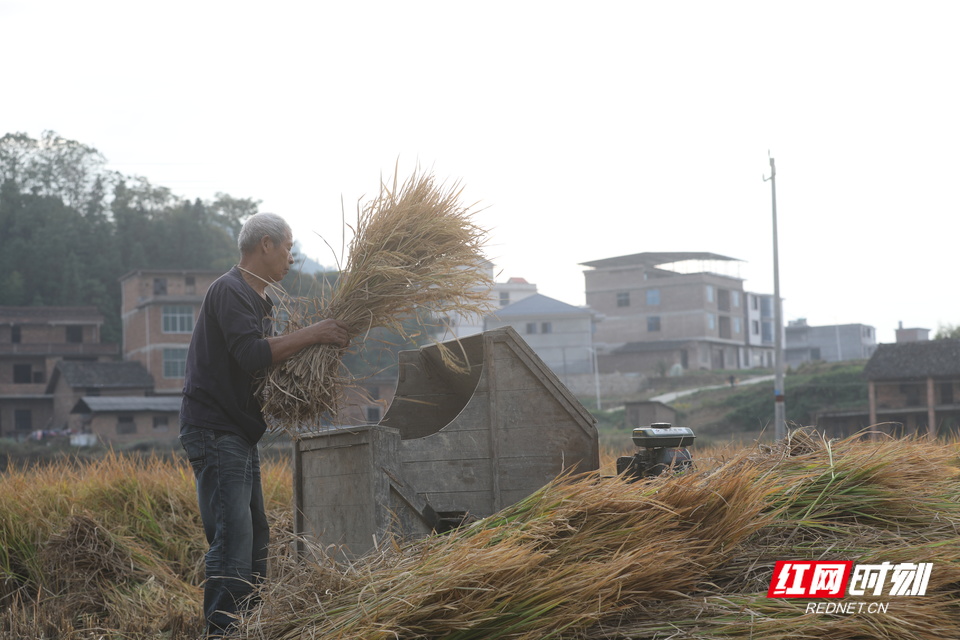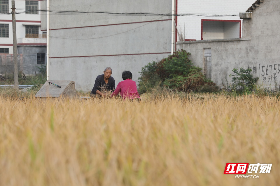 稻田一望无际,仿佛延伸至天边。 红网时刻新闻10月31日讯(记者 秦楼 王杨)10月30日,位于邵阳市邵东市灵官殿镇的省级粮食生产万亩综合示范片,双季稻迎来大丰收。连绵起伏的金色稻浪中,沉甸甸的稻穗压弯了禾秆。种粮户罗自生与老伴正操作着脱粒机进行田间作业。 伴随着机器的轰鸣,一束束饱满的稻穗被迅速卷入,金黄的谷粒瞬间分离,罗自生高兴地说:“今年收成好,亩产达到了1200斤。”