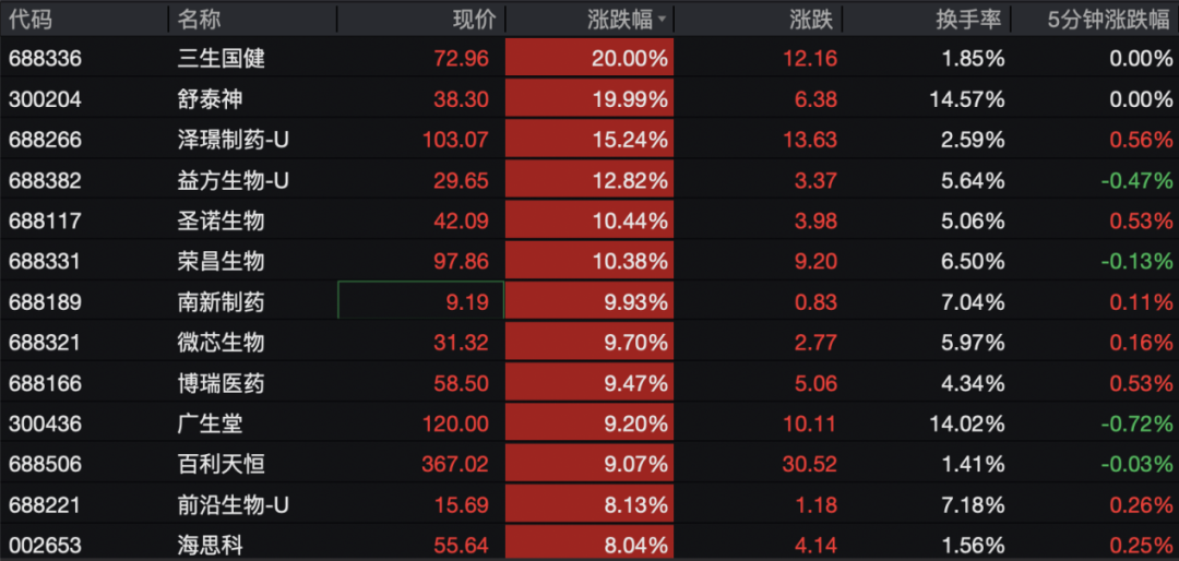 | 创新药赛道突然大爆发。 今日,A股、港股创新药概念股全线爆发,三生国健、舒泰神强势录得20%涨停。消息面,2025年国家医保谈判于10月30日在北京开启。今年国谈在延续医保目录常规调整机制的基础上,首次正式引入“商保创新药目录”机制。 与此同时,10月份以来,国产创新药“出海”进程明显提速,多起重量级BD(Business Development,商务合作拓展)交易落地。业内人士表示,10月份国产创新药BD的“井喷”是中国创新药产业进入全球主流梯队的集中兑现,中国创新药行业正进入商业化放量期,并逐步从本土市场迈向全球市场。 大爆发 10月31日,A股创新药概念股集体爆发,截至13:30,三生国健、舒泰神强势斩获20%涨停,泽璟制药-U、益方生物-U、圣诺生物、荣昌生物等个股大涨超10%,南新制药、广生堂、博瑞医药、百利天恒、前沿生物-U等个股跟涨。