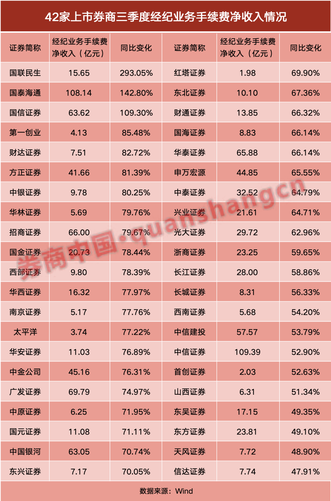 经纪业务普遍实现增长 东海证券研究指出,上市券商业绩大幅增长得益于市场行情回暖下的各业务条线基本面改善。其中,三季度日均A股成交额达2.1万亿元,同比增长211%,推动两融规模稳定在2.4万亿元平台上,较去年同期大幅提升;此外,交投活跃带动下的自营、资管业务也呈现边际复苏,推动基本面持续改善。 从三季报来看,业绩增长最大的驱动来自经纪业务和自营业务收入增加。三季报中,不少券商都将营收大幅增长归因于该点。记者根据Wind统计,42家上市券商(除国盛证券无可比数据)经纪业务手续费净收入规模均实现高增长,最低值也有47.91%。 这一指标增幅超过100%的券商分别是国联民生(293.05%)、国泰海通(142.80%)、国信证券(109.30%)。第一创业、财达证券、方正证券、中银证券等中小券商经纪业务增长也呈现“加速度”。 按经纪业务手续费净收入体量计,中信证券和国泰海通不相上下,分别是109.39亿元和108.14亿元,与其他券商拉开较大差距。广发证券、招商证券、华泰证券、国信证券、中国银河这一指标均在60亿元级别。