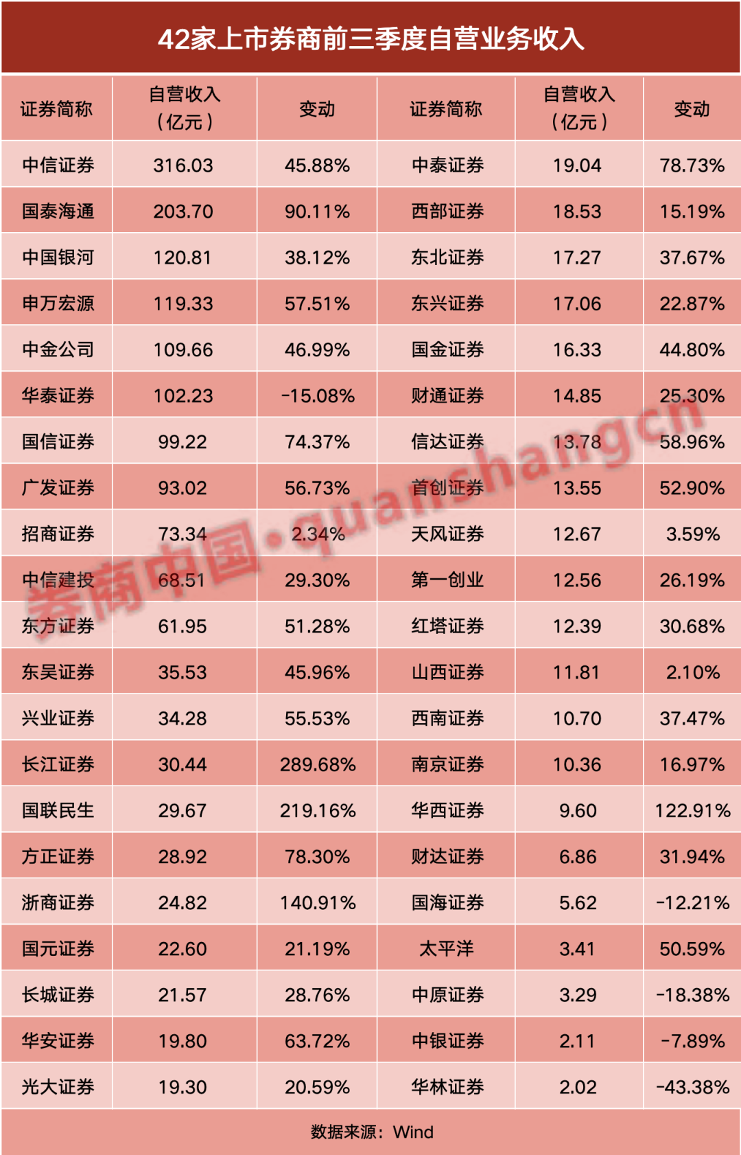 自营同比表现“冷热不均” 投资业务方面,三季度A股市场表现强劲,主要指数均实现显著上涨,结构性特征明显,科技与新能源板块引领行情,债券市场则整体走弱。在上述市场环境下,各家券商自营业务同比表现“冷热不均”。 按照自营收入=投资净收益+公允价值变动损益-对联营企业和合营企业的投资收益的公式计算,37家券商自营收入实现增长。其中,长江证券、国联民生、浙商证券、华西证券增幅超100%。 相比之下,有3家券商自营业务同比增幅不超过5%。中银证券、国海证券、华泰证券、中原证券、华林证券出现下滑。 按绝对值看,头部券商优势牢固,中信证券、国泰海通、中国银河、申万宏源、中金公司、华泰证券这6家自营业务收入都超过百亿元。