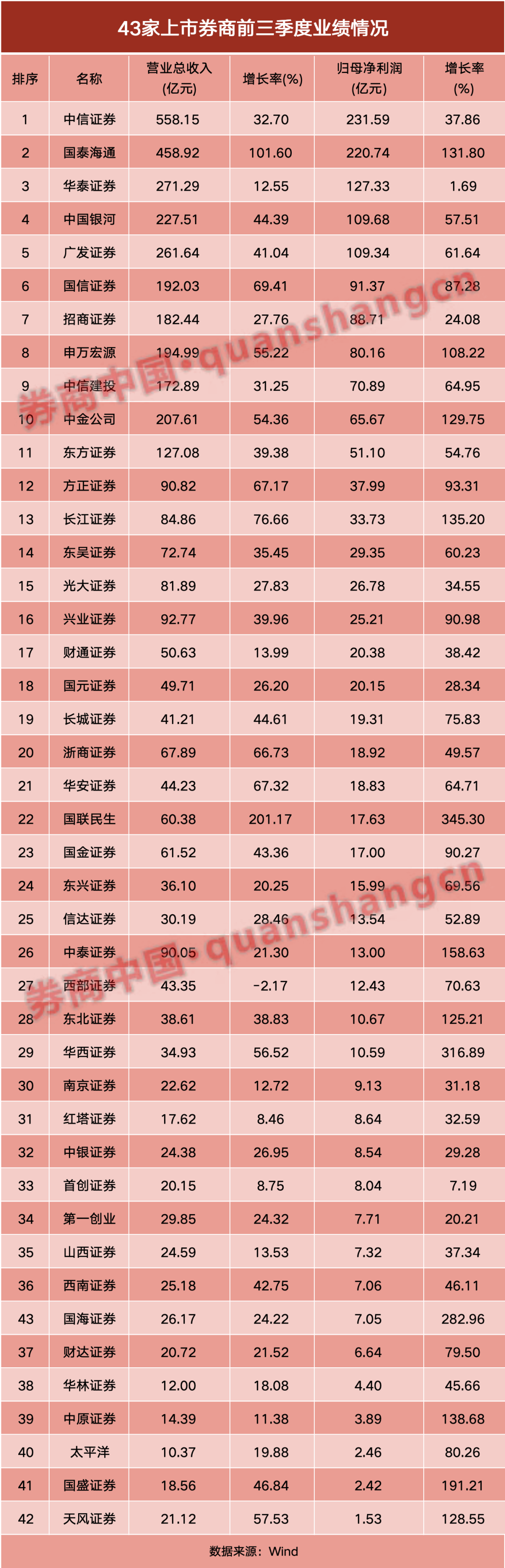 | 43家上市券商三季报已悉数披露。 前三季度上市券商归母净利润均实现增长,超六成增幅在50%以上。其中,国联民生、华西证券以超过3倍的增速成为“黑马”。 经纪与自营业务是券商业绩增长“双引擎”:受益市场交投持续活跃,券商经纪业务手续费净收入普遍高增,增速最低也有47.91%;自营业务是第一大收入来源,仅5家券商同比下滑。 与此同时,投行业务在政策暖风下显露触底回升迹象,手续费净收入合计251.51亿元,同比增长23.46%。不过,资管业务表现一般,手续费净收入同比呈现“跌多涨少”格局。 超六成券商归母净利润增幅超50% 在市场行情回暖的情况下,券商业绩迎来爆发。43家上市券商中,除西部证券外,余下均实现营收和归母净利润双增长。西部证券前三季度营收为43.35亿元,同比下降2.17%;归母净利润为12.43亿元,同比增长70.63%。 中信证券依然稳居行业龙头,前三季度实现营收558.15亿元,同比增长32.70%;实现归母净利润231.59亿元,同比增长37.86%。国泰海通位居第二,营收和规模净利润分别为458.9亿元和220.7亿元,并且同比增幅均“过百”。净利润百亿规模以上券商还有华泰证券(127.33亿元)、中国银河(109.68亿元)、广发证券(109.34亿元)。对比2025年中报,前十大券商阵容较为稳定。 从归母净利润同比变动看,超六成券商增幅在50%以上。其中又有12家同比增长超100%,包括国联民生、华西证券、国海证券、国盛证券、中泰证券、中原证券、长江证券、国泰海通、中金公司、天风证券、东北证券、申万宏源,可以看出大型券商和中小券商兼有。业绩爆发力最强的是国联民生和华西证券,前三季度归母净利润同比增长3倍有余。 归母净利润增幅未超过10%的仅有首创证券和华泰证券,不过,这也跟两家券商上年同期基数较高有关。其中,首创证券2025年前三季度实现营收20.15亿元,同比增长8.75%,归母净利润8.04亿元,同比增长7.19%;华泰证券前三季度实现营收271.29亿元,同比增长12.55%;归母净利润127.33亿元,同比增长1.69%。