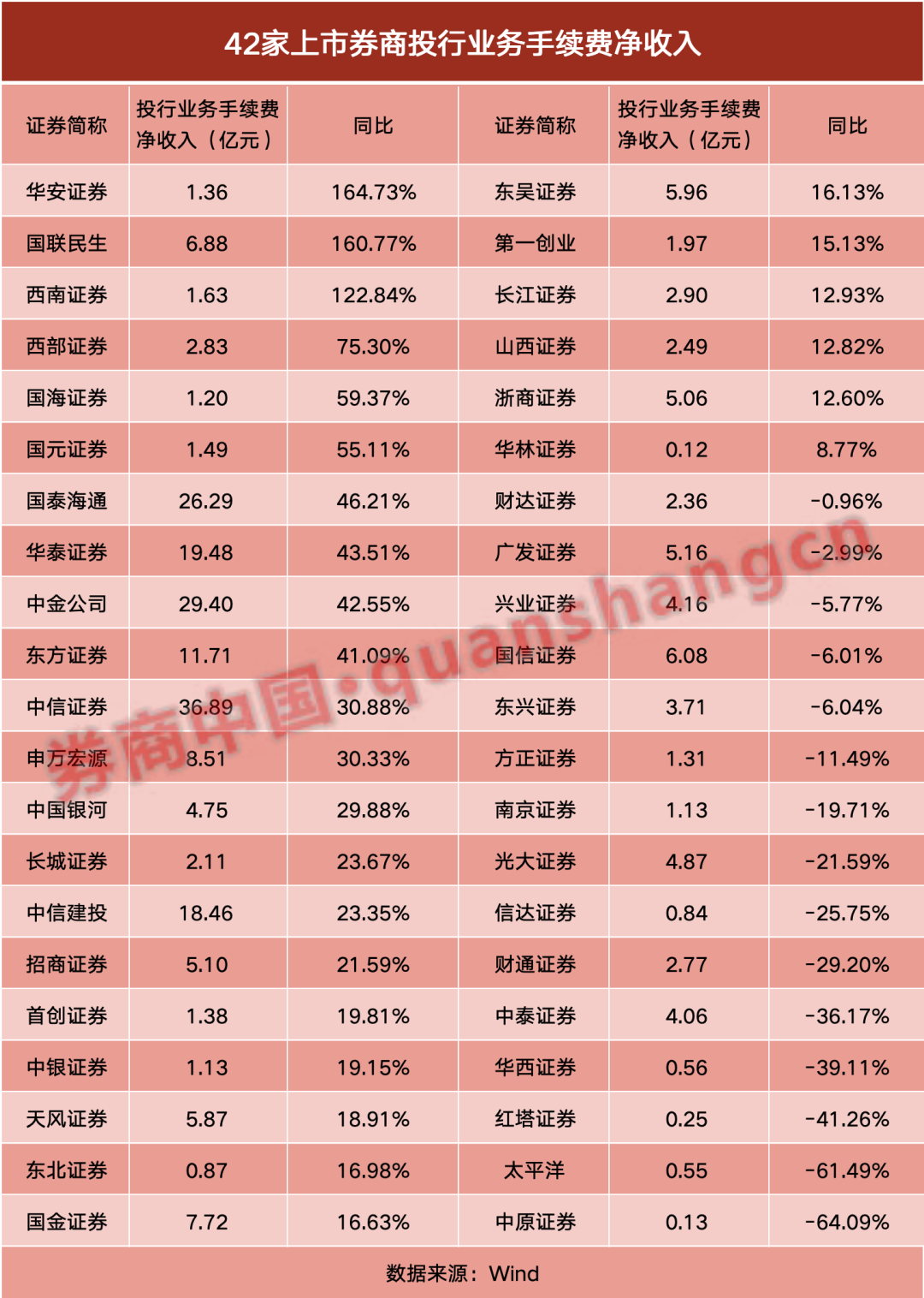 投行业务或触底回升,资管则面临压力 投行业务方面,虽然仍有15家券商的手续费净收入同比下滑,但相较上年同期,已有明显改善。42家券商投行业务手续费净收入合计251.51亿元,同比增长23.46%。 一些投行业务素有优势的大型券商,投行业务手续费净收入普遍增加。三季报统计数据显示,“三中一华”以及国泰海通占据收入榜前五名。但从增速看,华安证券、西南证券、西部证券、国海证券、国元证券等中小券商更胜一筹,其中不乏一些深耕地方且特色明显的券商。此外,一些券商虽然仍旧同比增速为负,但降幅明显收窄。 多位券商非银分析师认为,券商投行业务筑底回升趋势或明确。从市场环境来看,三季度股权融资回暖,IPO、增发、可转债的融资规模都有增长,港股股权融资市场也持续活跃,并购重组市场暖意不减。 在近日的2025金融街论坛年会上,多项深化创业板、北交所改革的利好政策相继推出。万联证券非银分析师认为,多层次市场体系包容性和覆盖面不断增强,投行业务将受益。