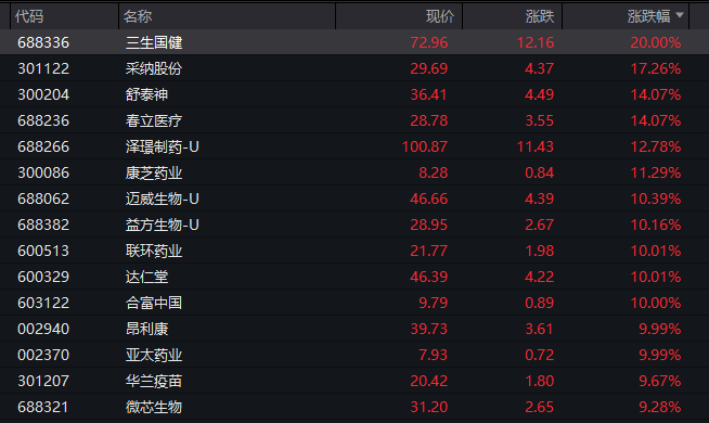 医药生物板块也大幅上涨,板块涨幅接近2%,板块内个股亦掀起涨停潮。三生国健“20cm”涨停,联环药业、达仁堂、合富中国、昂利康等多股盘中涨停。