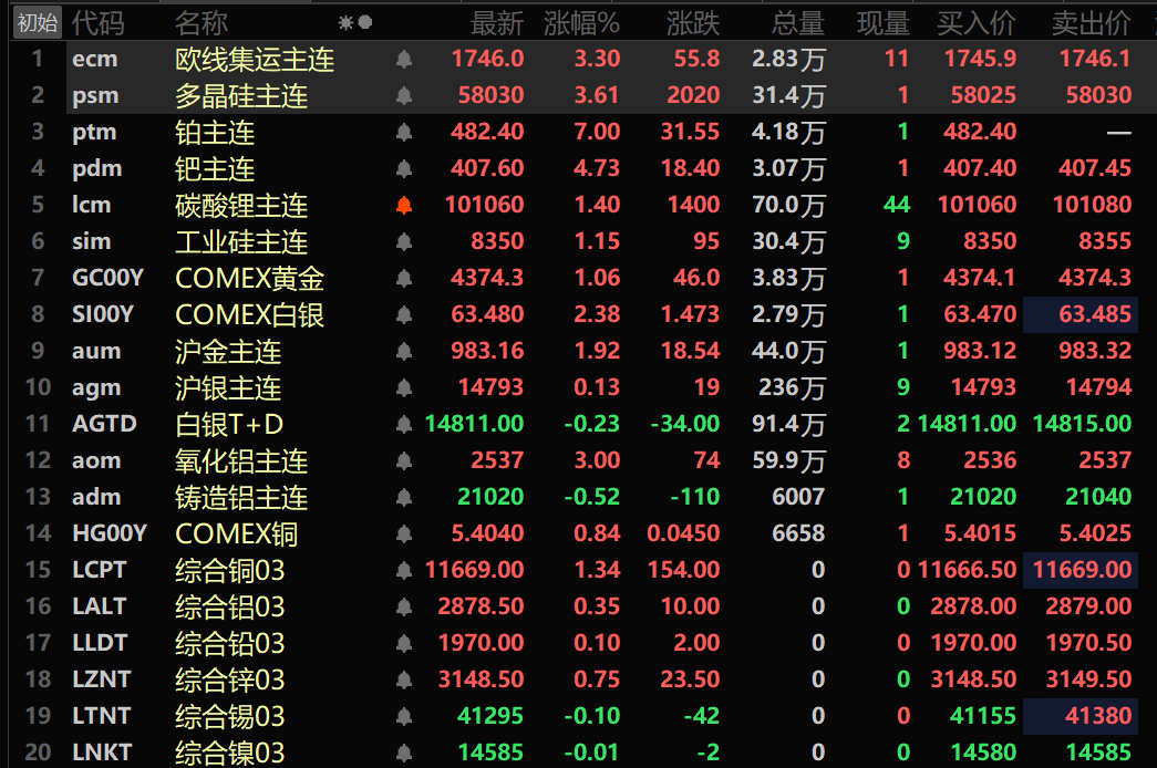 SMM 12月15日讯: 金属市场: 截至日间收盘,内盘基本金属集体下行,沪铜、沪铝分别跌1.22%、1.08%。沪锡跌0.91%,沪镍跌0.88%。沪铅跌0.67%,沪锌跌0.36%。氧化铝主连涨3%。铸造铝主连跌0.52%。 此外,碳酸锂主连涨1.4%,多晶硅主连涨3.61%,工业硅主连涨1.15%。欧线集运主连涨3.3%,报1746。 黑色系涨跌互现,铁矿跌0.92%,螺纹涨0.13%,热卷跌0.15%。不锈钢跌0.68%。双焦方面,焦煤涨3.16%。焦炭跌0.3%。 外盘方面,截至15:21分,外盘基本金属普涨,伦铜涨1.34%,伦锌涨0.75%。伦铝、伦铅涨幅均在0.4%以内。伦锡、伦镍小幅下跌。 贵金属方面,截至15:21分,COMEX黄金涨1.06%,逼近其历史高位4398美元/盎司;COMEX白银涨2.38%。国内方面,沪金涨1.92%,沪银涨0.13%。世界黄金协会发布的数据显示,11月全球实物黄金ETF流入达52亿美元,已连续6个月实现流入,叠加全球央行持续购金的支撑,黄金资产配置价值凸显。地缘方面,俄乌和平谈判虽持续推进但核心细节尚未落地,欧盟拟对俄央行资产实施长期冻结,泰柬边境冲突未现停火迹象,多重地缘不确定性共同推升市场避险情绪。(文华综合) 此外,铂主连期货以482.4元/克、7%的涨停幅度报收;钯主连期货涨4.73%。 国信期货评论表示,铂族金属走势继续受宏观情绪与板块联动主导。一方面,美联储内部政策信号不一,但整体宽松预期仍未扭转,支撑贵金属整体氛围;另一方面,地缘风险持续,叠加资金在金银强势后的扩散效应,推动具备一定金融属性的铂金获得补涨动能。钯金则受制于传统汽车需求前景疲软,表现相对温和。预计铂族金属短期或延续分化震荡,广期所铂金期货短期表现或相对更强。 截至今日15:21分行情