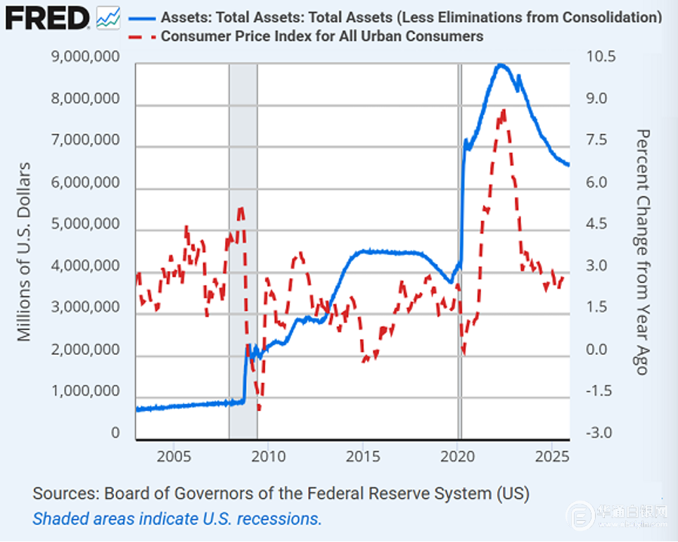 (美联储资产负债表总资产与美国CPI年通胀率的对比图) “因此量化宽松(或’隐形量化宽松’)又回来了。”一位资产经理表示,他指的是短期债券购买,将于本周五向市场参与者提供400亿美元,就像美联储和其他大多数西方央行在2009年开始的量化宽松一样。 “美联储的’储备管理购买’不是量化宽松。”博客作者Wolf Richter反驳道,他说美联储的声明意味着其政策“回到了2009年之前的资产负债表管理,即资产负债表的增长与经济增长同步或低于经济增长。” 专家顾问Andy Constans表示:“他们不希望这是量化宽松,所以他们专注于购买票据。” “(但)这显然是鸽派的,(因为)美联储认为,他们(在量化紧缩方面)走得太远了,而且通过径流耗尽了太多准备金。” 欧洲防务类股周四小幅回落,以欧元计算,其2025年的涨幅收窄至51.5%,但Stoxx Europe Total Market Aerospace&defense指数的涨幅是四年前俄罗斯乌克兰冲突以来的三倍。 与此同时,摩根士丹利资本国际世界股票指数(MSCI World Index)第七次试图突破去年10月底的历史高点,但以失败告终。 展望未来,联邦公开市场委员会周三的“点图”预测中重申了对2026年和2027年美国利率的中位数预测,即3.1%,尽管一位鸽派成员(最有可能是特朗普任命的白宫顾问斯蒂芬·米兰)将明年12月的利率目标从2.6%下调至2.1%。 在6月之前的每次会议上,美联储都一致同意保持利率不变,但昨天又出现了三种意见分歧,米兰呼吁降息50个基点,另外2名官员敦促保持不变,另外9名官员决定降息25个基点。 鲍威尔在周三的决定后新闻发布会上告诉记者,他希望在明年5月美国经济状况良好的情况下离开美联储。他称“实际上,关税是导致通胀超调的主要原因”。特朗普多次抨击他没有大幅削减借贷成本。 “影响将相对短暂,”鲍威尔继续道,“实际上是一次转变。我们(在美联储)的责任是确保这不会成为一个持续的通胀问题。” 截止北京时间09:40,华通现货白银定盘价报14721元。 白银网 |
