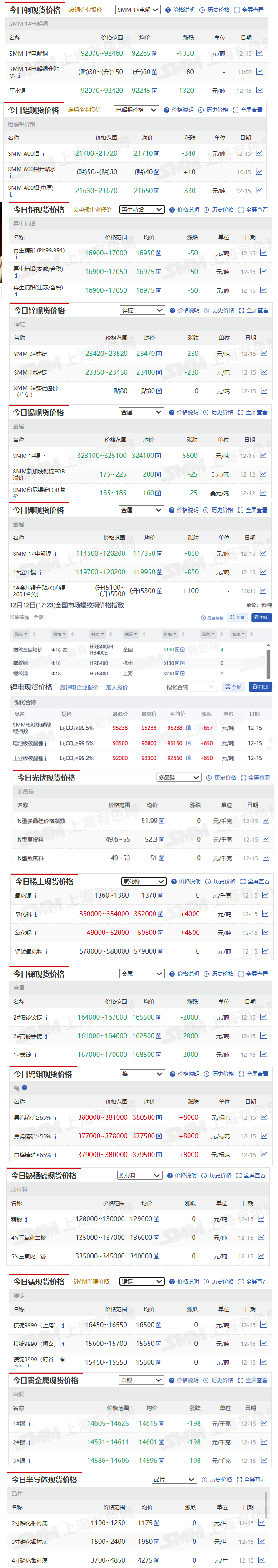 ►金属涨跌互现 多晶硅、纽银、沪金、碳酸锂、伦铜涨幅居前 铂主连涨停【SMM日评】 ►最后交易日沪铜现货成交清淡 预计明日依旧呈现贴水报价【SMM沪铜现货】 ►交割日铜价回落 市场活跃度略有回升【SMM华北铜现货】 ►SMM 上海及其他1#铅市场:铅价呈偏弱震荡 持货商清库积极性高于下游刚需【SMM午评】 ►再生铅:下游电池生产企业观望情绪浓厚 等待逢低接货【SMM铅午评】 ►上海锌:盘面高位回落 成交未见明显好转【SMM午评】 ►宁波锌:长单锌锭到货宁波 市场出货贸易商增多【SMM午评】 ►天津锌:盘面回落 但未至下游心理价位【SMM午评】 ►【SMM镍午评】12月15日镍价大幅下行,11月份规模以上工业增加值同比实际增长4.8% ►【SMM钢材航运】上周中国出口钢材总量环比下降7% ►【SMM煤焦航运】上周焦煤到港256.64吨 环比-48.22万吨