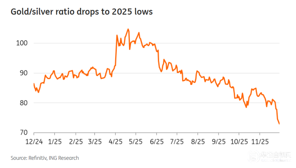 【华通白银网12月15日】•今年以来,白银价格飙升了近100%,远超黄金。 •这轮上涨是由供应短缺,太阳能和电动汽车的强劲工业需求,以及历史性的轧空所推动。 •尽管预计将出现波动,但2026年白银平均价格预测将达到55美元/盎司。 今年白银的表现明显优于黄金,截至12月初,白银价格飙升了近100%。 在不断变化的经济信号和不断变化的贸易关税政策的推动下,白银该轮反弹出现了大幅波动,而且高度不确定性持续存在,荷兰国际集团预计市场将进一步波动。 荷兰国际集团在其展望报告中表示,近期白银的强劲可归因于几个关键因素,即持续的供应短缺,以及白银在太阳能技术、电动汽车和电子产品领域的重要作用推动的强劲工业需求。 此外,作为黄金的替代品,对白银的投资兴趣已经复苏。 金银比已从特朗普“解放日”105的峰值大幅下降,目前处于今年以来的低点,低于70。 荷兰国际集团大宗商品策略师Ewa Manthey表示,这种下降表明,机构投资者对白银的信心日益增强。
