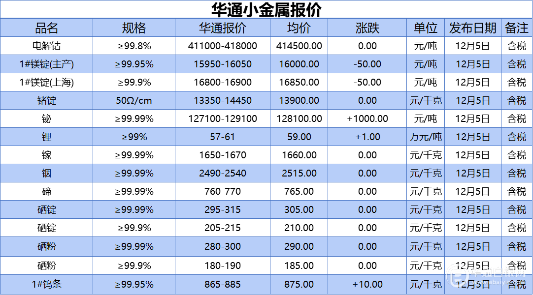 华通白银网 12月12日讯:电解钴、1#镁锭(生产)、1#镁锭(上海)、锗锭、铋、锂、镓、铟、碲、硒锭(99.99%)、硒锭(99.9%)、硒粉、硒粉(99.9%)、1#钨条报价