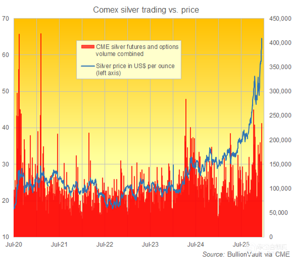 (纽约商品交易所白银期货和期权近5年日交易量图表) 盛宝银行的策略团队在最新报告中表示:“白银受到对硬资产的持续需求,以及紧张的供应前景的支撑。” 上周,白银ETF SLV规模增长0.1%,达到2022年7月以来的最大水平,当月增长3.1%,是6月份以来的最快增速。 上周伦敦市场,白银价格上涨了11.0%,这是自2020年8月第一波新冠疫情高峰以来的最大涨幅。 日本金银市场协会总干事Bruce Ikemizu表示:“上周五金价上涨的最大推动力,可以说是白银价格的大幅上涨。”他指出,纽约商品交易所白银交易量在上周创下新高后大幅飙升。 黄金支持的ETF信托基金上周也有所扩张,恢复到贵金属10月中旬的创纪录价格水平,因为SPDR黄金ETF和iShares黄金ETF的净投资者流入分别为0.3%和1.1%。 上海黄金交易所的黄金交易价格继续低于中国10月17日的历史基准高点,上涨1.3%至978元/克。 亚洲股市跟随华尔街上周五的跌幅下跌,被高估的人工智能股票领跌。 但欧洲股市上涨,泛欧斯托克600指数周一上涨0.8%,美国股指期货也有所上涨。 以欧元计价的黄金价格反弹至周五伦敦拍卖的新高3702欧元,而以英镑计价的英国黄金价格也收复了上个交易日的大部分失地,向3251英镑的新高点回落。 这是圣诞节前最后一个完整的星期,继上周外界普遍预期美联储下调美元利率之后,市场将把注意力转向周四的英国央行和欧洲央行会议(预计英国将降息0.25%,而欧元区20国维持不变),随后是周五的日本央行会议,交易一致支持加息0.25%。 与此同时,周二将公布美国11月就业数据,这是美国政府关门以来首次公布就业状况的重要数据;周四将公布美国11月消费者价格指数(CPI)。 截止北京时间09:40,华通现货白银定盘价报14872元。 白银网 |