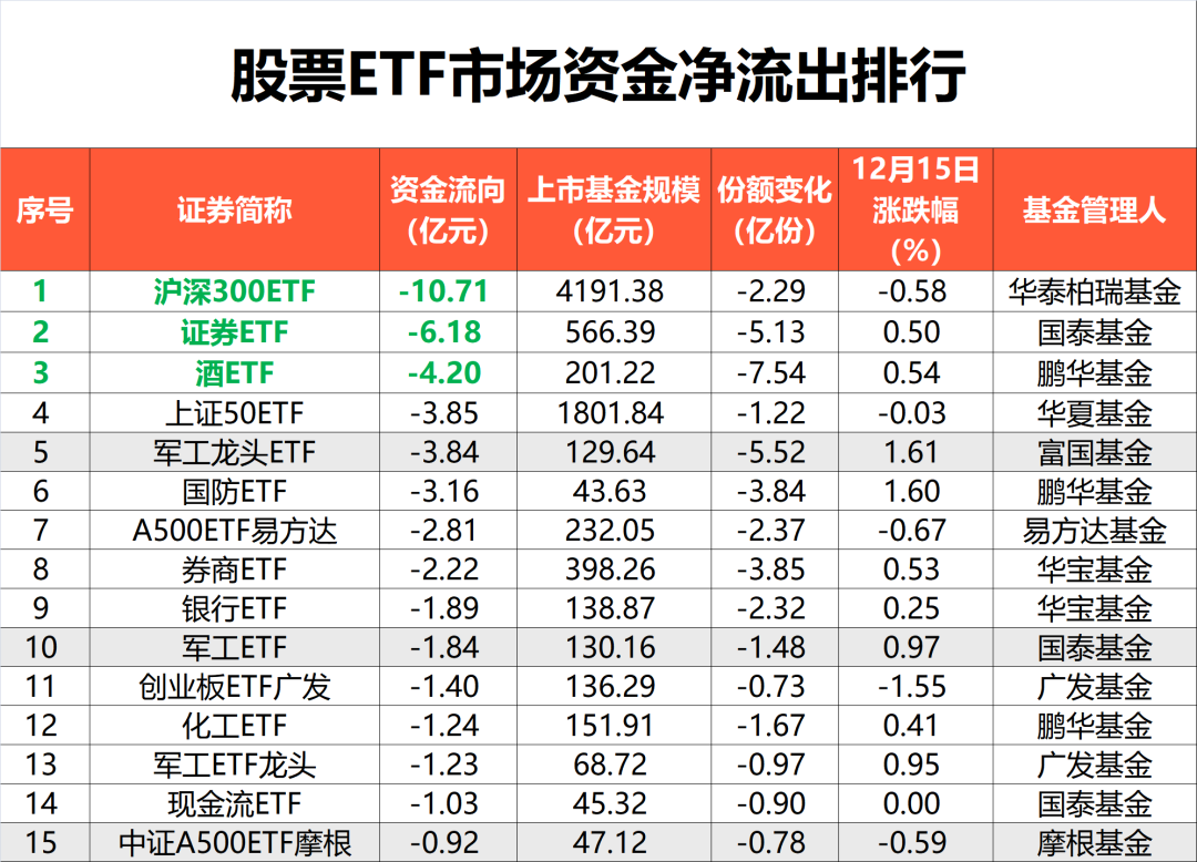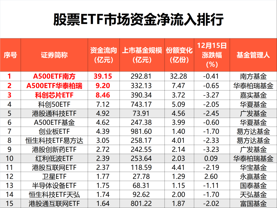 12月15日,A股震荡调整,深成指、创业板指均跌超1%。结构上,大消费板块逆市爆发,商业航天概念股继续活跃,算力硬件股走弱。 市场调整中,股票ETF再度“越跌越买”,昨日资金借道股票ETF净流入近75亿元。其中,中证A500指数、恒生科技指数等净流入居前。资金流出方面,昨日沪深300ETF,以及证券、酒等行业主题ETF净流出居前。 而近三个交易日股市调整,资金净买入已超185亿元。 昨日股票ETF市场净流入近75亿元 Wind数据显示,截至12月15日,全市场1275只股票ETF(含跨境ETF)总规模达4.58万亿元。 在昨日股市下跌行情中,股票ETF市场总份额增加62.89亿份,按照区间成交均价测算,净流入资金达74.57亿元。 从大类型来看,昨日宽基ETF与港股市场ETF净流入居前,分别达43.18亿元、26.85亿元;规模变化方面,宽基ETF规模下降165.88亿元。 具体到指数维度,昨日,中证A500指数净流入居前,达49.42亿元。其中,A500ETF南方净流入超39亿元,A500ETF华泰柏瑞净流入超9亿元,位居市场前列。 从5日角度观测,近期资金流入中证A500指数超132亿元,流入恒生科技指数超33亿元。