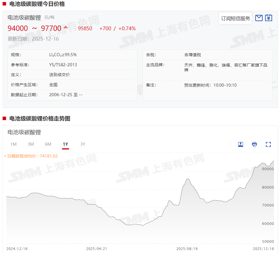 》点击查看SMM新能源产品现货报价 截至12月16日,受情绪面持续影响,碳酸锂期货盘面再度站稳十万元/吨的大关,下游材料厂持谨慎观望态度,采购意愿不强。市场实际成交清淡,以后点价为主。目前,上下游企业之间的年度长协谈判仍在持续,博弈焦点集中于明年的价格系数与采购量级。 从供需面来看,供应端,伴随部分新产线逐步投产以及下游需求对生产的拉动,预计12月国内碳酸锂产量仍将保持增长,环比增幅约为3%;需求方面,12月新能源汽车销量预计仍表现亮眼;储能市场则延续供需两旺态势,供应偏紧格局依旧。电芯及正极材料排产在12月预计仍处高位,环比略有下滑。综合来看,在供给稳步提升、需求整体相对持稳的背景下,预计12月碳酸锂仍将保持去库,但幅度较11月将有所放缓。 |