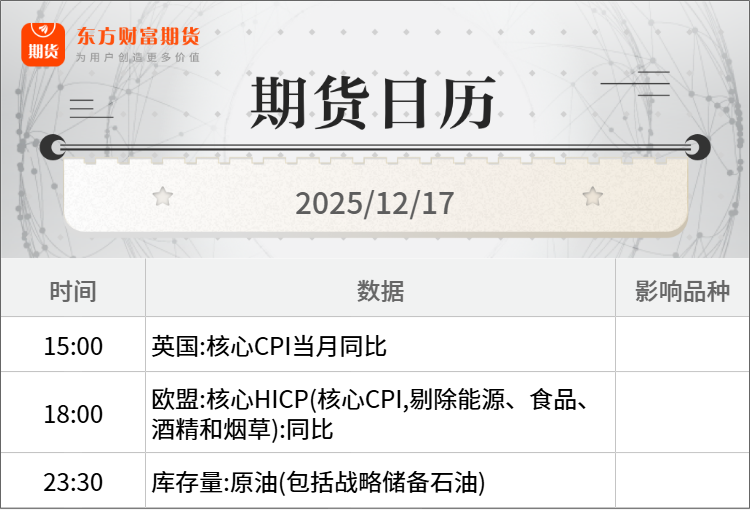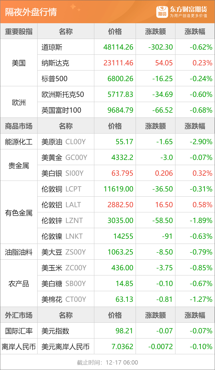 隔夜行情![]() ![]() 每日精选美国11月非农录得6.4万人 失业率为四年来新高 劳动力市场面临不确定性 黄金只是“开路先锋”?知名策略师:2026将是“大宗商品之年”! 油价持续下跌:俄乌会谈叠加供应过剩 WTI价格创四年来新低 宏观产经新华社:针对内需发展现状如何?提振消费、扩大投资的空间和动力在哪里?中央财办有关负责同志表示,扩大内需是明年排在首位的重点任务。今年我国内需总体保持稳健,前三季度内需对经济增长贡献率达到71%。提振消费政策成效明显,扩大有效投资扎实推进。我们也注意到,近几个月消费和投资增速有所放缓,需要持续加力扩内需。明年要把握消费的结构性变化,从供需两侧发力提振消费。 新华社:针对着力稳定房地产市场明年会采取哪些措施?中央财办有关负责同志表示,下一步,重点要抓好几件事。一是从供需两端发力稳市场。二是积极推动房地产企业转型发展。支持房企加快从以新房销售为主向更多持有物业、提供高品质多样化居住服务转型。三是加快构建房地产发展新模式。改革完善房地产开发、融资、销售等基础制度,合理把握房地产发展新模式各项基础制度出台时机,深化住房公积金制度改革,渐进推开立“新”破“旧”,推动新旧模式平稳转换。 新华社:针对综合整治“内卷式”竞争方面有哪些新手段?中央财办有关负责同志表示,企业层面,要深入整治“内卷式”竞争。要加快完善重点行业产能调控机制,加强动态监测预警,既让落后产能有序退出,也让新增优质产能平稳接续。要强化综合治理,加强行业自律、标准引领,综合运用信用监管、价格执法、反垄断和反不正当竞争等监管手段,着力规范市场竞争秩序,形成优质优价、良性竞争的市场生态,更好发挥市场机制优胜劣汰功能。 品种资讯黑色系期货 钢材:12月16日,全国300家长、短流程代表钢厂废钢库存总量523.33万吨,增0.23%;库存周转天7.9天,持平;日消耗总量55.86万吨,增0.20%;日到货总量57.06万吨,降1.14%。(我的钢铁网) 铁矿石:12月15日,中国47港进口铁矿石港口库存总量16092.66万吨,较上周一增68.68万吨;45港库存总量15382.46万吨,环比增33.48万吨。(我的钢铁网) 焦煤:中信证券研报称,日前行业专业媒体“我的钢铁网”报道了钢铁产品重新纳入出口许可证管理的消息,预计政策有可能抑制未来钢铁出口量,影响国内钢材产量及焦煤需求。中信证券认为,政策或在短期影响焦煤价格预期,但中长期看,对优质主焦煤需求也存在结构性的支撑,对长期焦煤价格不宜过度悲观。(证券时报网) 农产品期货 生猪:商务部公布对原产于欧盟的进口相关猪肉及猪副产品反倾销调查的最终裁定。其中提到,根据《反倾销条例》第三十八条的规定,商务部向国务院关税税则委员会提出征收反倾销税的建议,国务院关税税则委员会根据商务部的建议作出决定,自2025年12月17日起,对原产于欧盟的进口相关猪肉及猪副产品征收反倾销税,实施期限5年。(商务部网站) 棕榈油:南部半岛棕榈油压榨商协会(SPPOMA)数据显示,2025年12月1-15日马来西亚棕榈油单产环比上月同期减少2.55%,出油率环比上月同期减少0.08%,产量环比上月同期减少2.97%。(新华财经) 豆粕:上周国内油厂大豆压榨量略有下降,豆粕延续去库趋势。预计12月大豆到港量有所下降,全月大豆压榨量约870万吨,较11月减少约30万吨,月底油厂豆粕库存或降至90万吨左右。(国家粮油信息中心) 有色/贵金属期货 碳酸锂:据我的钢铁网(Mysteel)数据显示,12月16日MMLC电池级碳酸锂(早盘)价格较前一日上涨1300元/吨,中间价报97800元/吨。(Mysteel) 铂钯:摩根士丹利表示,预计2026年铂金价格将达到每盎司1775美元,钯金价格为每盎司1325美元。(新华财经) 沪金:摩根士丹利表示,鉴于市场预期降息将持续、美元指数有望再度走弱,黄金或将持续获得宏观面支撑,预计到2026年第四季度金价将达到每盎司4800美元。(财联社) 沪银:摩根士丹利表示,白银的投资需求或将持续占据主导地位,库存处于低位的情况下,现货市场存在出现逼仓行情的可能性。(财联社) 沪镍:摩根士丹利预计,2026年镍价将回升至每吨15,500美元附近,届时镍市供需增速将基本持平。(财联社) 沪铜:摩根士丹利预计2025年铜供应将出现26万吨的缺口,2026年缺口将进一步扩大至60万吨,几乎没有进一步可以承受供应中断的空间。(财联社) 能化期货 原油:中东原油基准迪拜原油正显示出供应过剩加剧的迹象,迪拜原油的远期曲线正在迅速走弱。亚洲交易商和炼油商以迪拜原油为基准进行交易。据知情交易员和经纪商称,1月和2月合约之间的价差在周二早盘一度变为负值,为每桶负2美元。(财联社) 烧碱:12月16日,山东液碱市场涨跌互现,部分库存降低企业,低价拉涨,个别企业因外卖量增加影响,价格小幅下调。鲁西南32%离子膜碱主流成交670-720;鲁中东部32%离子膜碱主流成交685-750,50%离子膜碱主流成交1110-1200;鲁北32%离子膜碱主流成交710-770;鲁南32%离子膜碱主流成交730-735。(单位:元/吨)(隆众资讯) 橡胶:12月,云南、海南、广东产区陆续停割,国内原料供应将明显减少;年底购车需求或集中释放,有望带动乘用车及重卡市场销量走高,这些均对天然橡胶市场价格有所支撑。但国外主产区处于旺产期,随着降雨后期恢复生产,整体供应看涨;天然橡胶进口量迎来季节性增长,社会库存和保税区库存将持续累库;合成橡胶价格持续走低,一定