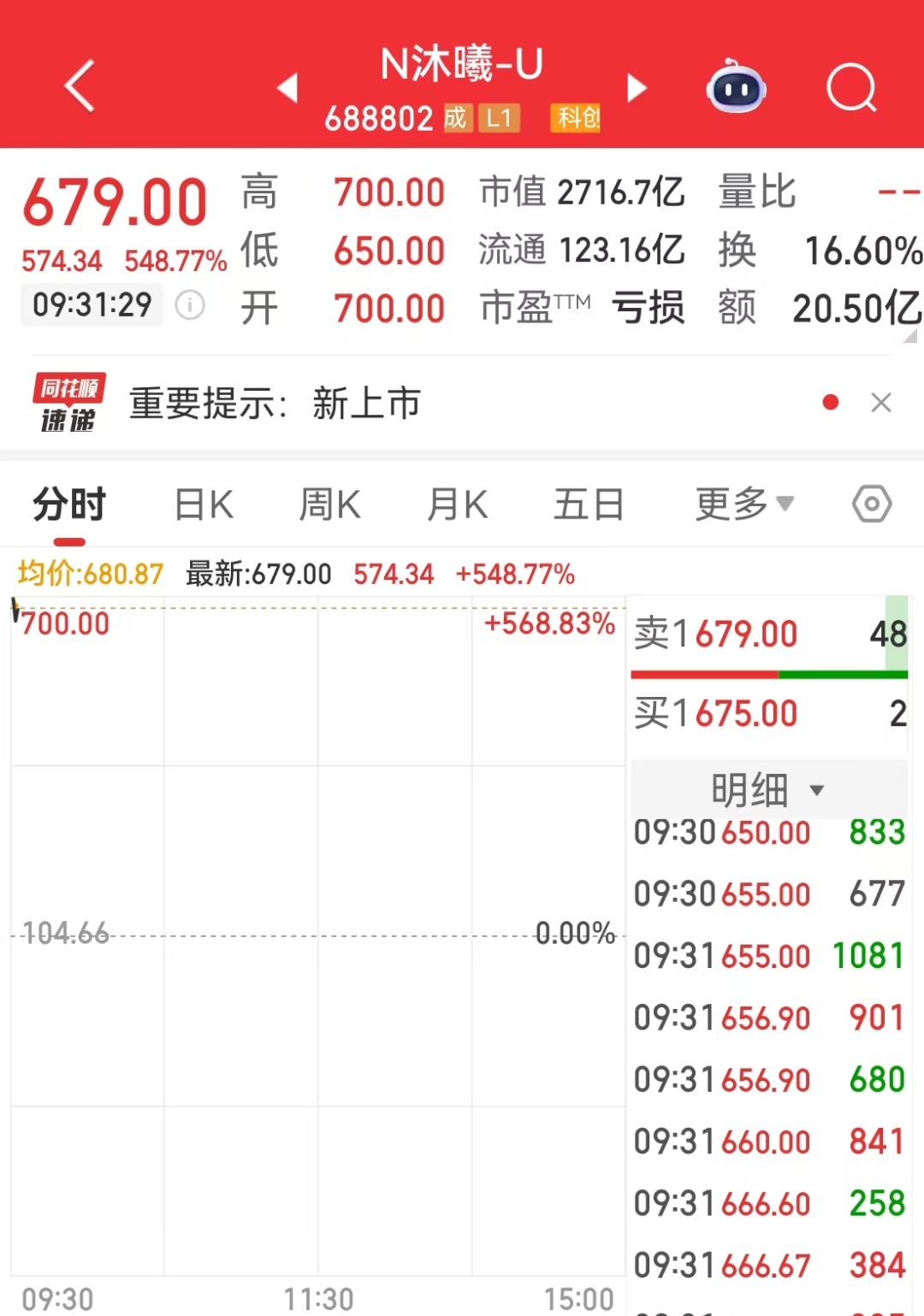 新股速递:N沐曦-U开盘大涨568.83%,中一签赚近30万元 N沐曦-U今日(12月17日)在科创板上市,因公司目前尚未盈利,自上市之日起将纳入科创成长层。该股开盘价700元,开盘涨幅为568.83%;以开盘价计算,中一签赚29.77万元,超越摩尔线程-U。 该公司是国内高性能通用GPU产品的主要领军企业之一,主营业务为研发、设计和销售应用于人工智能训练和推理、通用计算与图形渲染领域的全栈GPU产品,并围绕GPU芯片提供配套的软件栈与计算平台。 公司表示,在可预见的未来,随着AI芯片行业的高速增长以及国产替代的持续加速,公司主营业务的市场空间将更加广阔,预计公司达到盈亏平衡点的预期时间最早为2026年。