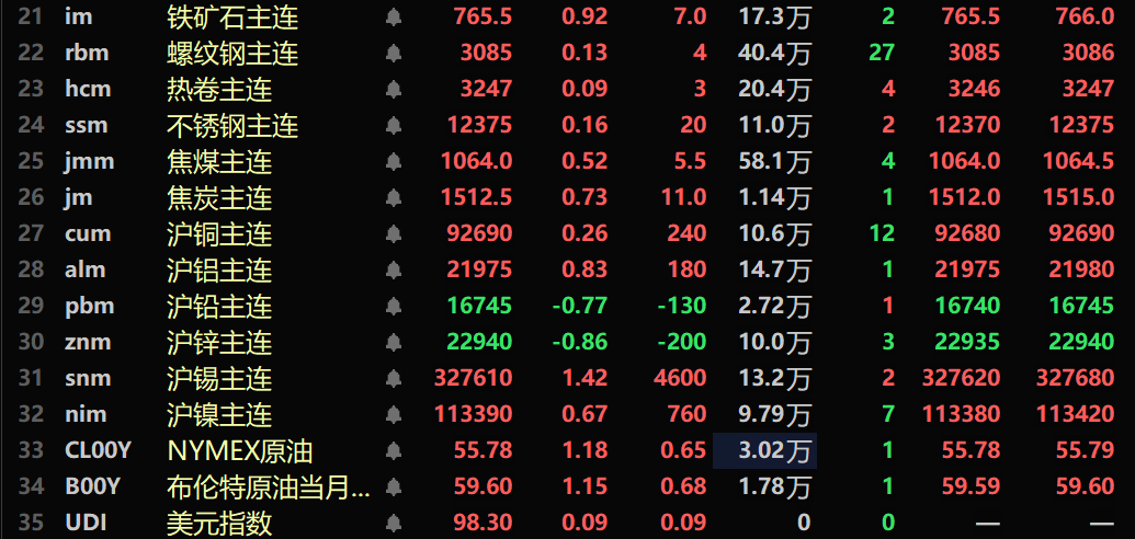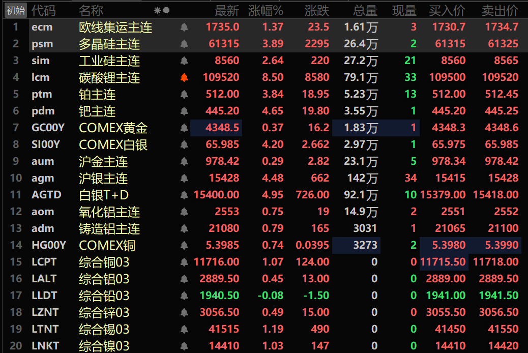 SMM12月17日讯: 金属市场方面: 截至午间收盘,内盘基本金属普涨,沪锡涨1.42%,沪铜涨0.26%。沪铝涨0.83%。沪铅跌0.77%,沪锌跌0.86%。沪镍涨0.67%。 此外,铸造铝主连期货涨0.79%,氧化铝主连涨0.75%。碳酸锂主连涨8.5%。工业硅主连涨2.64%。多晶硅主连涨3.89%。 黑色系均飘红,铁矿涨0.92%,螺纹涨0.13%,热卷微涨,不锈钢涨0.16%。双焦方面:焦煤主力合约涨0.52%,焦炭主力合约涨0.73%。 外盘金属方面,截至11:40分,LME金属近全线上涨,伦铜涨1.07%。伦锡涨1.19%。伦铝涨0.45%,伦铅跌0.08%。伦锌涨0.49%。伦镍涨1.03%。 贵金属方面,截至11:40分,COMEX黄金涨0.37%;COMEX白银涨4.2%,盘中刷新历史新高至66.27美元/盎司。内盘贵金属方面:沪金主连涨0.29%;沪银主连涨4.48%,盘中刷新历史新高至15477元/千克。 此外,截至午间收盘,铂主连期货涨3.84%,钯主连期货涨4.65%。 截至午间收盘,欧线集运主力合约涨1.37%,报1735点。 截至12月17日11:40分,部分期货午间行情: