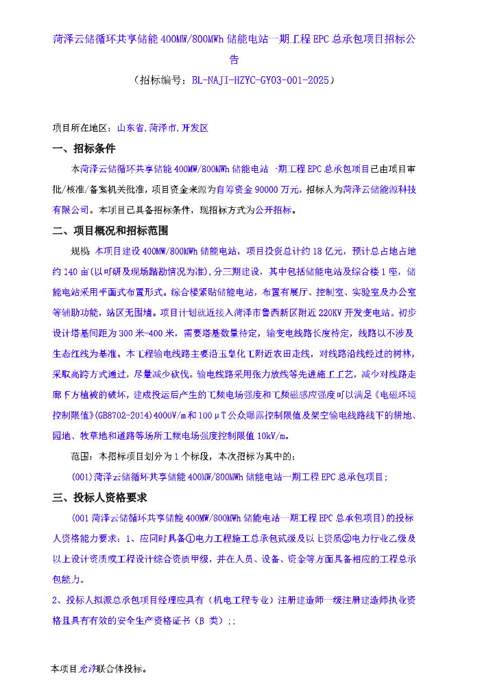 北极星储能网,12月15日,菏泽云储循环共享储能400MW/800MWh储能电站一期工程EPC总承包项目招标公告发布。 据公告,该项目招标人为菏泽云储能源科技有限公司,项目资金为90000万元,折合单价为1.125 元 / Wh。 本项目建设400MW/800MWh储能电站,项目投资总计约18亿元,预计总占地占地约140亩(以可研及现场踏勘情况为准),分三期建设,其中包括储能电站及综合楼1座,储能电站采用平面式布置形式。综合楼紧贴储能电站,布置有展厅、控制室、实验室及办公室等辅助功能,站区无围墙。项目计划就近接入菏泽市鲁西新区附近220KV开发变电站。初步设计塔基间距为300米-400米,需要塔基数量待定,输变电线路长度待定,线路以不涉及生态红线为基准。本工程输电线路主要沿玉皇化工附近农田走线,对线路沿线经过的树林,采取高跨方式通过,尽量减少砍伐。输电线路采用张力放线等先进施工工艺,减少对线路走廊下方植被的破坏,建成投运后产生的工频电场强度和工频磁感应强度可以满足《电磁环境控制限值》(GB8702-2014)4000V/m和100μT公众曝露控制限值及架空输电线路线下的耕地园地、牧草地和道路等场所工频电场强度控制限值10kV/m。 本项目允许联合体投标。 原公告如下: