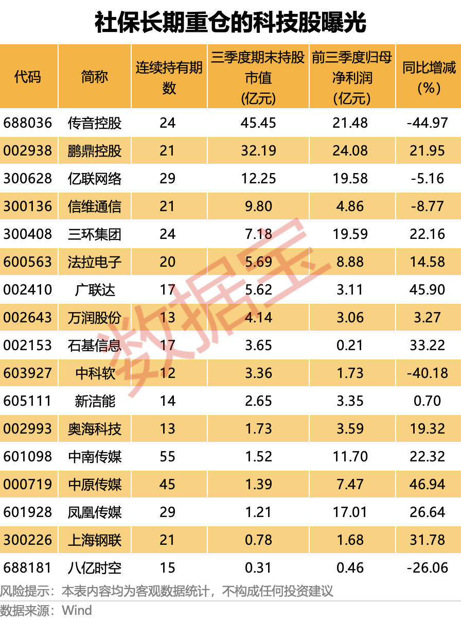 全国社保基金一一一组合和社保基金四二零组合三季度新进建仓巨人网络2784.82万股,期末持股市值超12.58亿元位居次席。 太平洋证券表示,公司征途IP系列游戏稳健运营,《超自然行动组》贡献增量。未来随着《超自然行动组》《原始征途》等递延收入的陆续确认,有望推动公司业绩逐步释放。 此外,社保基金三季度还新进成为亨通光电、乐鑫科技、生益科技等个股的前十大流通股东,期末持仓市值均超5亿元。 长期持仓股曝光 值得注意的是,社保基金还长期重仓了一些科技股。数据显示,社保基金连续重仓中南传媒、中原传媒、凤凰传媒、亿联网络、三环集团、传音控股6股24个季度及以上。其中传音控股、亿联网络等个股期末持仓市值均超10亿元。 银河证券表示,亿联网络是全球视频会议市场龙头,看好公司AI会议产品及云办公终端方面需求,产品竞争力增加带来的市场份额提升和业绩增长,公司基本盘经营稳健推进高质量发展。 除了上述个股外,还有11只科技股获社保基金重仓3年以上。其中,鹏鼎控股期末持股市值超32亿元。 整体来看,社保长期重仓的科技股主要分为两个类型,一是行业龙头标的,且分红较为大方;另外就是股息率较高的传媒股。