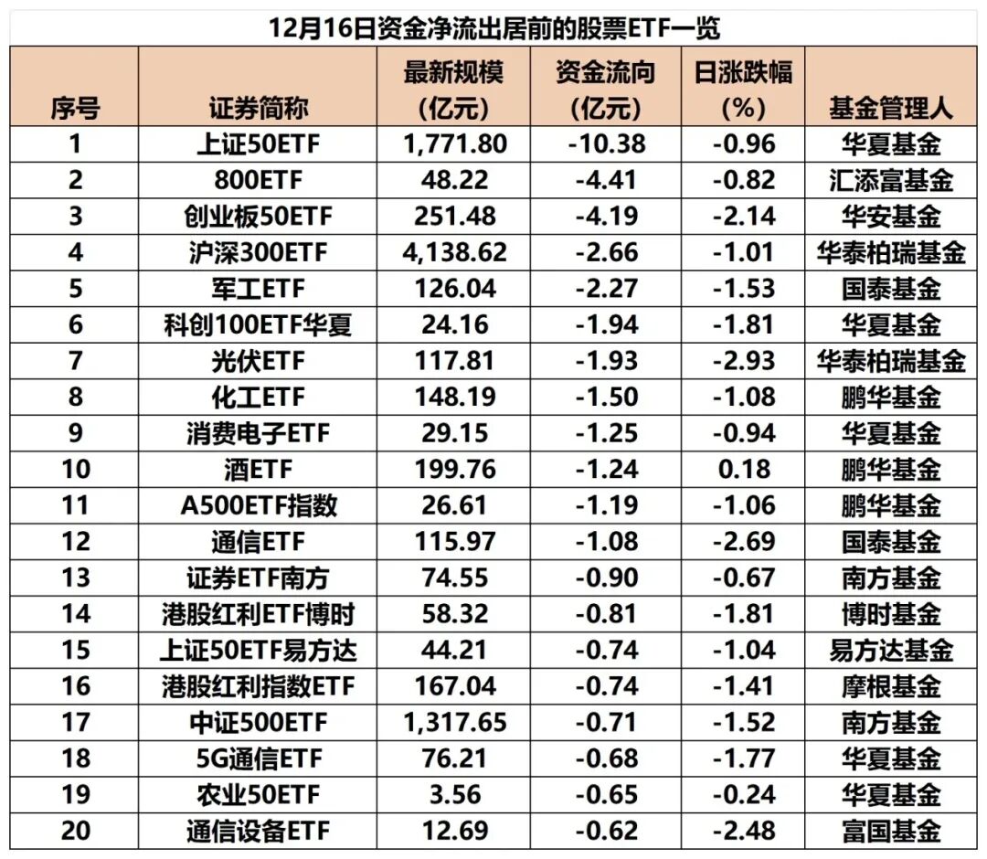 从单日资金净流出排行看,上证50ETF、800ETF、创业板50ETF、沪深300ETF等宽基ETF成为“失血”大户。