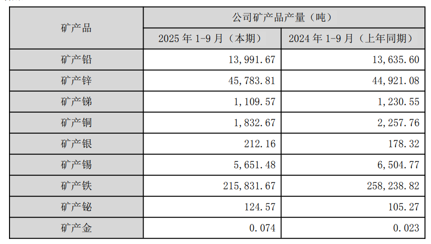兴业银锡三季报显示:营业收入本期数较上期数增加 24.36%,营业成本本期数较上期数增加47.56%,主要原因:报告期公司购买宇邦矿业 85%股权并纳入合并报表范围,矿产银产销量同比增长;银漫矿业受采区停产(2025 年 3 月 9 日停产,4 月 16 日复产)等因素影响,成本增加;乾金达矿业加大掘进、安措工程投入,成本同比上升。 兴业银锡三季报公告的其他主要事项中介绍了2025 年 1-9 月,公司业绩情况、矿产品产量及营业收入构成情况: 业绩情况:2025 年 1-9 月,公司实现营业收入 409,942.59 万元,较上年同期增加24.36%;归属于上市公司股东净利润 136,407.51 万元,较上年同期增加4.94%。截至2025 年 9 月 30 日,公司资产总额 1,751,338.51 万元,归属于上市公司股东的净资产915,836.80 万元。 矿产品产量:2025 年 1-9 月,公司生产矿产锡 5,651.48 吨,较上年同期减少13.12%;矿产银 212.16 吨,较上年同期增加 18.98%;矿产锌 45,783.81 吨,较上年同期增加1.92%;矿产铅 13,991.67 吨,较上年同期增加 2.61%;矿产铜1,832.67 吨,较上年同期减少 18.83%;矿产锑 1,109.57 吨,较上年同期减少 9.83%;矿产铁21.58 万吨,较上年同期减少 16.42%。矿产铋 124.57 吨,较上年同期增加 18.33%,矿产金0.074 吨,较上年同期增加 221.74%。