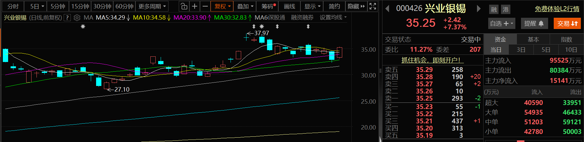 12月17日,兴业银锡的股价出现大幅上涨,截至12月17日14:11分,兴业银锡涨7.37%,报35.25元/股。