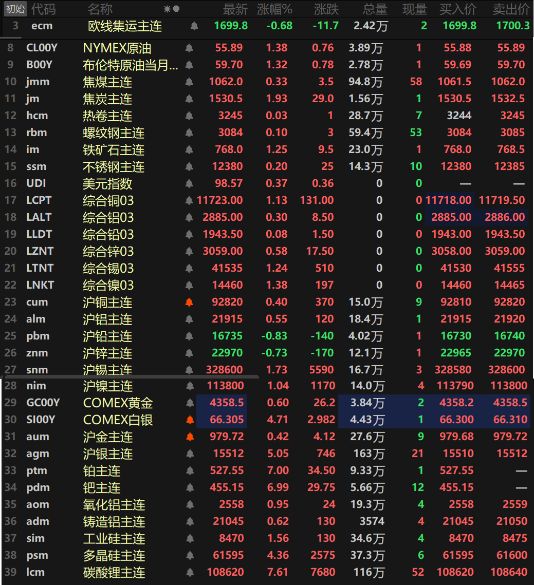 SMM 12月17日讯: 金属市场: 截至日间收盘,内盘基本金属普涨,仅沪铅和沪锌一同下跌,沪铅跌0.83%,沪锌跌0.73%。沪锡、沪镍一同涨逾1%,沪锡涨1.73%,沪镍涨1.04%,其余内盘基本金属涨幅均在1%以内。氧化铝主连涨0.95%,铸造铝主连涨0.62%。 此外,碳酸锂主连大涨7.61%,工业硅主连涨1.56%,多晶硅主连涨4.36%,多晶硅主连盘中最高冲至61985元/吨,刷新其上市以来的历史新高。欧线集运主连跌0.68%报1699.8。 黑色系方面集体上涨,铁矿涨1.25%,双焦方面,焦煤涨0.33%,焦炭涨1.93%,其余涨幅均小幅波动。 外盘方面,截至15:04分,外盘基本金属均飘红,伦铜、伦锡以及伦镍一同涨逾1%,伦铜涨1.13%,伦锡涨1.24%,伦镍涨1.38%。其余金属涨幅均在1%以内。 贵金属方面,截至15:04分,COMEX黄金涨0.6%,COMEX白银涨4.71%,盘中最高冲至66.65美元/盎司,续刷其上市以来的历史新高;国内方面,沪金涨0.42%,沪银涨5.05%,沪银盘中最高冲至15555元/千克,继续刷新其上市新高。 此外,铂、钯主连一同封死涨停板,铂主连以7%的涨幅报527.55元/克,钯主连以6.99%的涨幅报455.15元/克。 截至今日15:04分行情