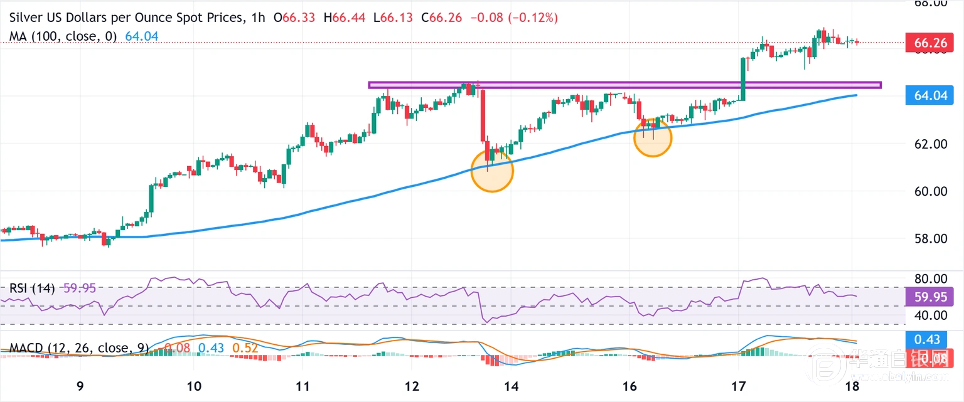 (华通国标一号银日K线图) 隔夜突破64.00美元关口附近水平阻力位,被视为触发白银买盘的关键因素,并确认了短期积极前景。该关口目前与100小时简单移动均线的关键支撑位重合,预计将为银价提供强力支撑,成为短期交易者的关键枢轴点。 相对强弱指标(RSI)在1小时图表上为59.95,中性至看涨,但在日线图上显示为超买状态。异同移动均线(MACD)滑落至零以下,表明MACD线穿过信号线下方,动量冷却。尽管如此,整体格局仍保持温和看涨 此外,100小时均线的上行趋势表明,任何修正性下滑都更有可能吸引逢低买入。只要银价持稳于该上升的均线上方,则白银将保持看涨基调;反之,若明确跌破该支撑位,则可能开启更深度的回调。若MACD指标重返正区间,且相对强弱指标(RSI)持稳于50上方,则将巩固看涨前景。 白银1小时图