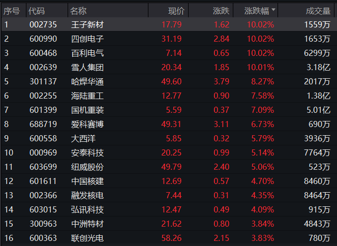 *ST铖昌具有商业航天概念。公司此前在投资者问答平台上表示,公司在低轨卫星通信领域具备优势,不仅是国内率先提供完整解决方案的企业,研制的T/R芯片在关键性能上也具备一定的领先优势。随着卫星的密集批量发射和组网应用,该领域将成为公司营收新的增长点。 受商业航天概念火热影响,*ST铖昌前期显著上涨,12月5日开始的10个交易日里,收获9个涨停板,其间累计涨幅达到59.08%。公司多次发布股票交易异常波动公告表示,公司目前经营情况正常,内外部经营环境未发生重大变化,敬请广大投资者理性投资,注意风险。 可控核聚变板块持续活跃 早盘,A股可控核聚变板块集体拉升,概念股平均上涨2.84%,四创电子、王子新材、百利电气、雪人集团4股涨停;其中雪人集团早盘涨停封单金额达到5.78亿元,哈焊华通、海陆重工、国机重装涨幅均超过7%。