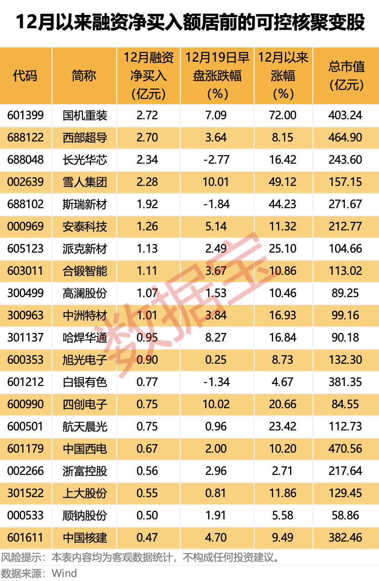近期,可控核聚变概念持续迎来政策利好。“十五五”规划建议提出,要前瞻布局核聚变能等六大未来产业。此外,中共安徽省委关于制定国民经济和社会发展第十五个五年规划的建议发布,其中提出,前瞻布局未来产业,推动包括核聚变能在内的多个未来产业成为新的经济增长点。 华创证券研报显示,核聚变中标项目显著放量,根据其统计的中科院等离子体所及聚变新能安徽的招标数据,11月单月招标金额达到39亿量级,进入到12月,行业转而迎来密集中标潮。核聚变项目国内外资本开支有望提速,将带动产业链订单放量,预计未来3~5年将是核聚变项目投招标的高峰时期,统计国内主要核聚变项目预计投入达到1465亿元。 在政策、资金面的支持下,今年以来我国核聚变商业化进程持续加速。7月,国内首台商业化直线型场反位形聚变装置HHMAX-901主机在成都市龙泉驿区建设完成,标志着直线型场反位形可控核聚变技术在商业化应用上取得重大突破。 中科清能研发制造的3kW@4.5K氦制冷机于10月15日在合肥一次启机成功,为我国核聚变领域已投产的最大制冷功率氦制冷机。 10股获融资净买入超1亿元 据证券时报·数据宝统计,A股中布局可控核聚变产业链的概念股共有59只。从资金流向上来看,12月以来,杠杆资金显著加仓可控核聚变板块,融资净买入合计金额达到10.52亿元。10股融资净买入超1亿元,国机重装、西部超导、长光华芯融资净买入金额居前,分别达到2.72亿元、2.7亿元、2.34亿元。 国机重装早盘触及涨停板,股价创下2020年8月以来新高。公司在投资者问答平台上表示,“十四五”时期以来,公司积极布局未来产业,加强可控核聚变装置关键材料及零部件技术研发及产业化应用研究,基于前期的技术研发成果和制造业绩,公司于2023年11月获得了紧凑型聚变能实验装置BEST TF线圈盒的首套制造项目,目前项目推进顺利,将于近期完工交货。