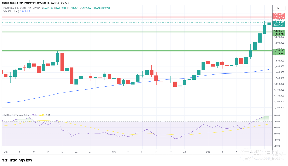 随着强劲涨势的继续,铂金创下新高。相对强弱指标处于超买区域,因此回调的风险正在增加。 如果铂金跌破1915美元,则将向最近的支撑位1870-1880美元前进。 截止北京时间09:40,华通现货白银定盘价报15100元。 白银网 |
