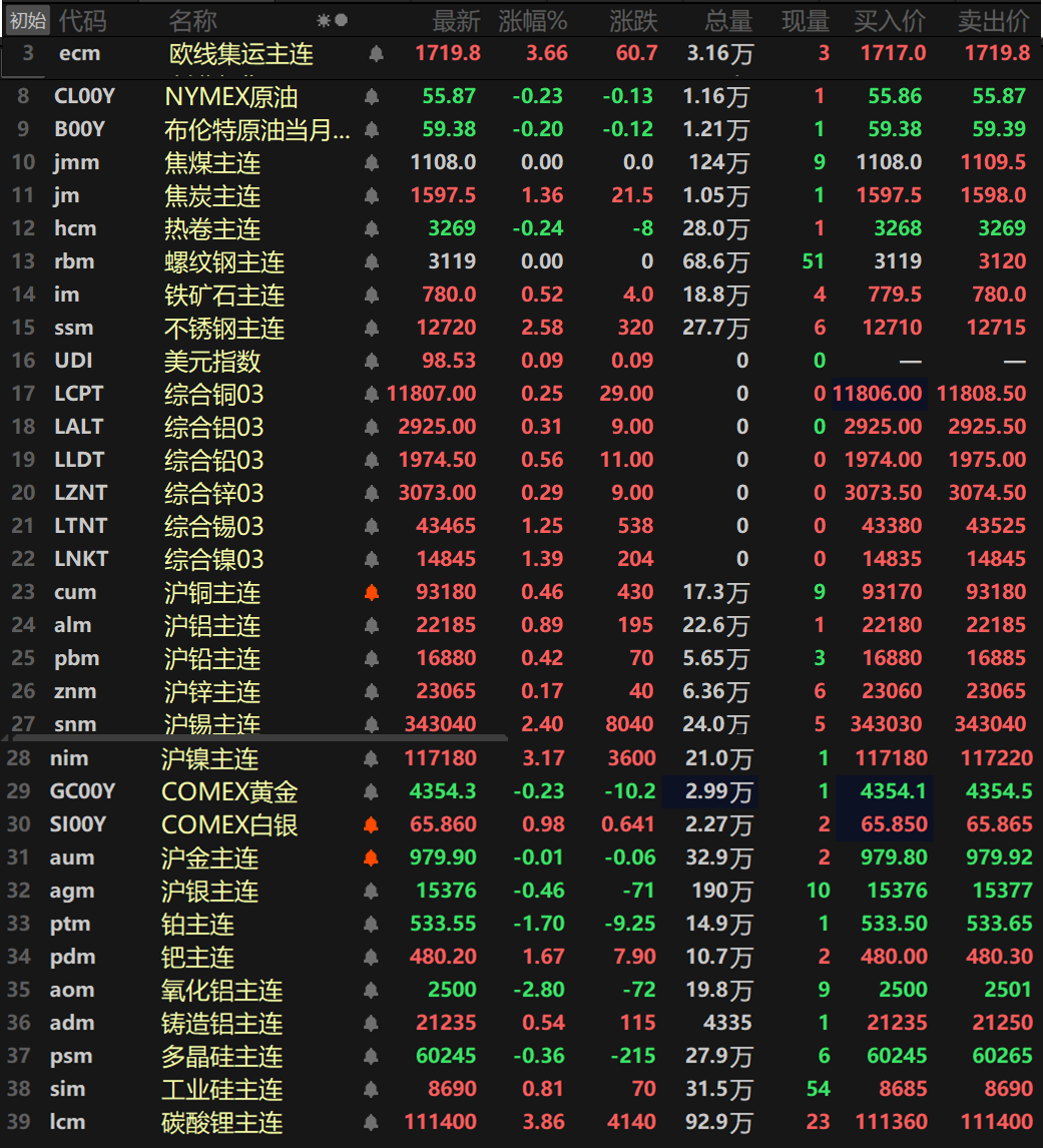 SMM 12月19日讯: 金属市场: 截至日间收盘,内盘基本金属集体上涨,沪镍以3.17%的涨幅领涨,沪锡涨2.4%。其余金属涨幅均在1%以内。氧化铝主连跌2.8%,铸造铝主连涨0.54%。 此外,碳酸锂主连涨3.86%,工业硅主连涨0.81%,多晶硅主连跌0.36%。欧线集运主连涨3.66%报1719.8。 黑色系方面涨跌互现,不锈钢涨2.58%,铁矿涨0.52%。螺纹暂时持稳于3119元/吨,热卷跌0.24%。双焦方面,焦煤暂时持稳于1108元/吨,焦炭涨1.36%。 外盘方面,截至15:04分,外盘基本金属普涨,伦锡、伦镍一同涨逾1%,伦锡涨1.25%,伦镍涨1.39%。其余金属涨幅均在1%以内。 贵金属方面,截至15:04分,COMEX黄金跌0.23%,COMEX白银涨0.98%。国内方面,沪金跌0.01%,沪银跌0.46%。 此外,铂主连跌1.7%,钯主连涨1.67%。 截至今日15:04分行情