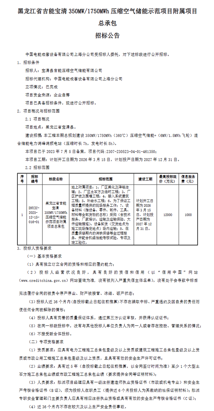 北极星储能网获悉,12月16日,黑龙江省吉能宝清350MW/1750MWh压缩空气储能示范项目附属项目总承包招标公告公示。