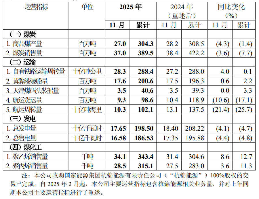 中国神华在公告中表示:2025 年 11 月,本公司航运货运量及周转量同比下降的主要原因,是业务结构调整、航线结构变化。 2025 年 1-11 月,本公司聚乙烯、聚丙烯销售量同比增长的主要原因,是上年同期煤制烯烃生产设备按计划检修导致基数较低。 中国神华11月30日晚间公告,公司持股约52%的控股子公司国能广投北海发电有限公司二期扩建工程项目(北海二期)3号机组顺利通过168小时试运行,移交商业运营。北海二期位于广西壮族自治区北海市铁山港区,是广西能源发展“十四五”规划重点工程,规划建设2台100万千瓦超超临界一次再热燃煤发电机组。项目采用超净燃煤发电、深度调峰等先进技术,调峰深度达到国内领先水平,设计供电煤耗为266.86克/千瓦时,实现废水、固废零排放和大气污染物超低排放。公告显示,目前,北海二期4号发电机组建设工作正稳步推进,计划于2025年12月投入运行。北海二期全部投运后,将优化区域电源结构,提升电网安全稳定水平,有效满足中长期负荷增长需求,为我国西部陆海新通道建设及区域经济社会发展提供重要支撑。 中国神华此前发布的三季报显示:2025年前三季度实现营收2131.51亿元,同比下降16.6%;净利润390.52亿元,同比下降10%。其中,第三季度实现营收750.42亿元,同比下降13.1%;净利润144.11亿元,同比下降6.2%。