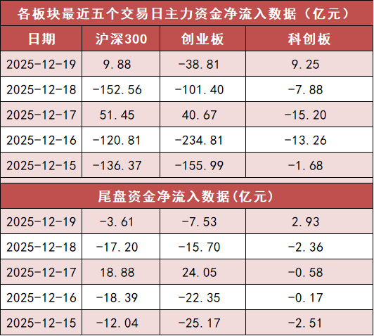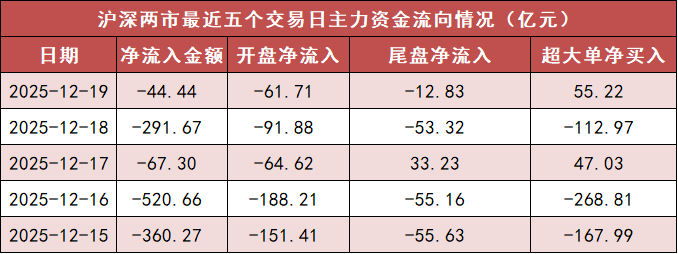 12月19日,A股市场整体上涨。 截至收盘,上证指数收报3890.45点,上涨0.36%;深证成指收报13140.21点,上涨0.66%;创业板指收报3122.24点,上涨0.49%。两市合计成交17259.15亿元,较上一交易日增加704.32亿元。 1. 两市主力资金净流出超40亿元 今日沪深两市主力资金开盘净流出61.71亿元,尾盘净流出12.83亿元,两市全天主力资金净流出44.44亿元。