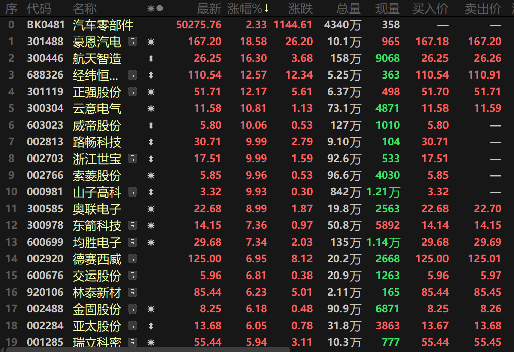 SMM 12月19日讯:今日早间,汽车零部件板块盘中快速拉涨,指数盘中一度涨逾2%。个股方面,豪恩汽电、航天智造、正强股份等多股涨逾10%,威帝股份、路畅科技、浙江世宝、索菱股份、山子高科等多股封死涨停板,东箭科技、均胜电子等多股纷纷跟涨。