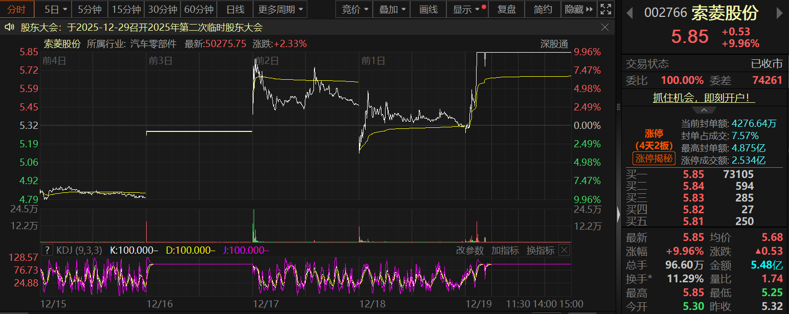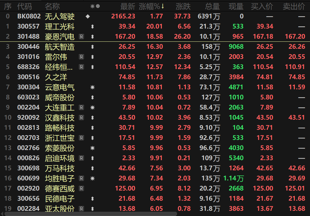12月17日,由投资者在互动平台询问浙江世宝称,“近日,工信部正式公布L3级自动驾驶车型有条件准入,请问公司产品是否有应用到相关车企车型上,与相关车企是否有合作?”的问题,浙江世宝回应称,公司与众多国内传统车企及新势力车企均有长期配套合作,公司的智能转向、线控转向、电调管柱等产品均适用于L3及以上自动驾驶。工信部L3自动驾驶准入目录的公布,有利于推进高级别自动驾驶的上路及普及,将会促进公司智能化转向产品的推广及量产。 索菱股份在今日也一同涨停,录得四天两板的战绩,公开资料显示,公司一家专业从事CID系统研发、生产、销售,并以此为基础向客户提供专业车联网服务的国家级高新技术企业,属于行业领先企业之一,经营项目包括车载智能终端、汽车自动驾驶系统及软硬件等。