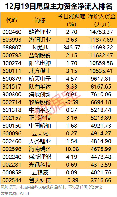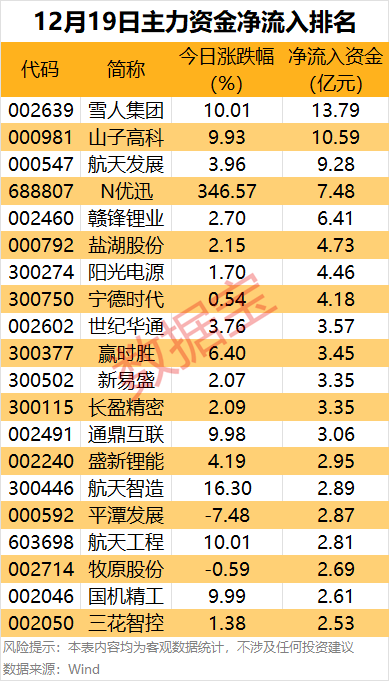 汽车、机械设备行业主力资金净流入均超20亿元。 A股三大指数今日(12月19日)集体上涨,行业板块呈现普涨态势,房地产服务、商业百货、包装材料、食品饮料、纺织服装、家用轻工、汽车服务、房地产开发板块涨幅居前,贵金属、半导体板块跌幅居前。 据证券时报·数据宝统计,今日沪深两市主力资金净流出44.44亿元。从行业来看,申万一级行业中有12个行业主力资金净流入,其中汽车、机械设备行业主力资金净流入均超20亿元,居前;有色金属、传媒、商贸零售、基础化工等行业主力资金净流入金额均超3亿元。 19个主力资金净流出的行业中,电子、医药生物、交通运输行业主力资金净流出金额居前,分别为29.79亿元、25.45亿元、10.31亿元;食品饮料、国防军工、轻工制造、非银金融、通信行业主力资金净流出金额均超5亿元。 可控核聚变概念股获主力资金抢筹 从个股来看,28股主力资金净流入超2亿元,其中8股净流入金额超4亿元。 雪人集团主力资金净流入13.79亿元,今日可控核聚变概念盘中强势拉升,雪人集团涨停。龙虎榜数据显示,上榜营业部席位全天成交16.34亿元,合计净卖出4900.62万元。具体来看,机构合计净卖出5547.36万元。此外,国泰海通证券上海静安区新闸路证券营业部、国盛证券杭州建设三路证券营业部分别净买入2.01亿元、1.54亿元。 山子高科主力资金净流入10.59亿元,该股今日也涨停,龙虎榜数据显示,上榜营业部席位全天成交7.25亿元,合计净买入2.08亿元。具体来看,机构合计净买入5811.53万元;此外,深股通专用、开源证券西安西大街证券营业部分别净买入911.09万元、6766.01万元。 N优迅为今日上市新股,今日收盘上涨346.57%,主力资金净买入7.48亿元。公司在光通信电芯片设计领域形成了完备的核心技术体系,在收发合一、高速调制、光电协同等关键领域实现国产化技术突破。