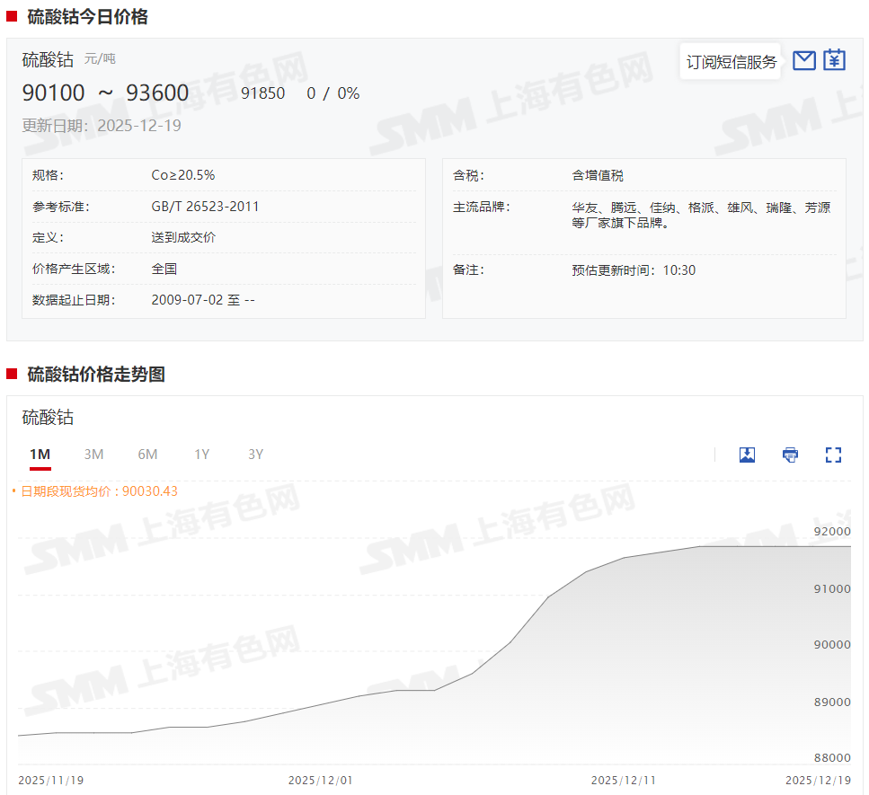 》查看SMM钴锂现货报价 据SMM了解,供应端,原料成本支撑下,冶炼厂继续挺价;贸易商环节在近几个月持续出货后,可流通库存相对有限,叠加当前临近年末,企业存在控制资金占用和仓位的要求,出货意愿减弱,仅维护核心客户;需求端无太大变化,仍维持刚需采买节奏。 当前钴盐价格接近45万元/金属吨,钴盐与钴金属间的价差在扣除反融成本后,给予相对合理的利润,预期在钴金属自身供需基本面没有额外变动的情况下,短期内价格将维持震荡趋势,后续价格上涨仍需等待钴盐价格上涨带动金属跟涨。 钴盐方面(硫酸钴及氯化钴): 硫酸钴: 据SMM现货报价显示,本周硫酸钴现货报价在周初上涨100元/吨之后维持稳定,截至12月19日,硫酸钴现货报价涨至90100~93600元/吨,均价报91850元/吨,较12月12日涨幅达0.11%。