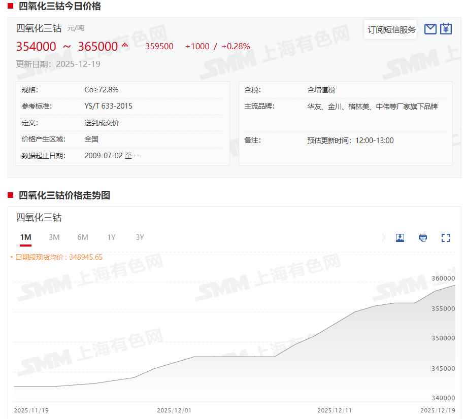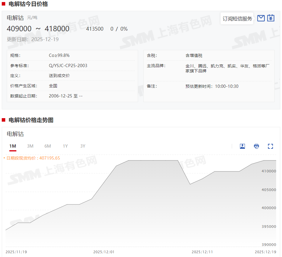 据SMM了解,本周四氧化三钴市场需求依旧旺盛,市场整体呈现稳健格局。供应端呈现集中挺价态势,头部生产企业报价已攀升至36.0-36.5万元/吨的高位。由于下游需求稳定,主要供应商多以执行长协订单为主,流向市场的散单比例持续下降,进一步加剧了现货资源的紧张氛围;需求端,正极材料企业目前采购策略谨慎,主要以满足现有生产订单进行补库。由于近期下游新增订单增速有所放缓,来自正极厂的额外批量采购与囤货需求已明显减弱。当前的高价已接近阶段性顶部,在缺乏更强需求增量驱动的情况下,SMM预计短期内四氧化三钴价格将进入平稳期,以持稳为主。 消息面上,12月10日前后,财联社方面称,据相关报道,美国国防部正通过国家国防储备计划大规模囤积关键矿产,涵盖锂、钴、石墨及稀土等38种能源转型核心材料。 钴作为目前公认的战略资源,在今年2月份刚果(金)实施钴出口禁令以来,其价格的大幅波动屡屡引发市场热议。SMM现货报价显示,2月份以来,电解钴已经从年内低点的162500元/吨涨至如今的413500元/吨,涨幅达251000元/吨,涨幅高达154.46%。 据SMM了解,根据最新的企业出口进度,试点企业可能在12月底或1月初实现出口,而其他企业出口进程仍偏慢,2025年内出口可能性较小,考虑3个月左右的运输周期,预计刚果金钴中间品将在明年3、4月才能陆续到港,原料结构性偏紧逻辑不变。因此,当前钴中间品市场延续偏强态势,维持“有价无市”的格局。截至12月19日,钴中间品(CIF中国)现货报价暂时维持在24.7~25美元/磅,均价报24.85美元/磅。 企业动态方面,据中国有色金属报消息,近日金川镍钴新材料公司一套全流程自动化、操作精细化的小块钴智能剪板机组投入使用。该生产线的建成,不仅让小块钴剪切实现“人海战术”到“智能流”的跨越,更提供了一套针对高难度脆性材料全自动加工的完整解决方案。其生产效率较传统半自动机组提升了2倍以上、产品合格率达99.8%、重体力劳动彻底解放。这些实打实的效益,成为金川钴开拓市场的“硬实力”。 金川镍钴新材料公司经营计划部相关负责人孙戈表示,“钴金属的特殊性决定我们要时刻紧跟市场变化,品质的跃升直接带来市场议价能力的增强和客户黏性的提升。”》点击查看详情 |