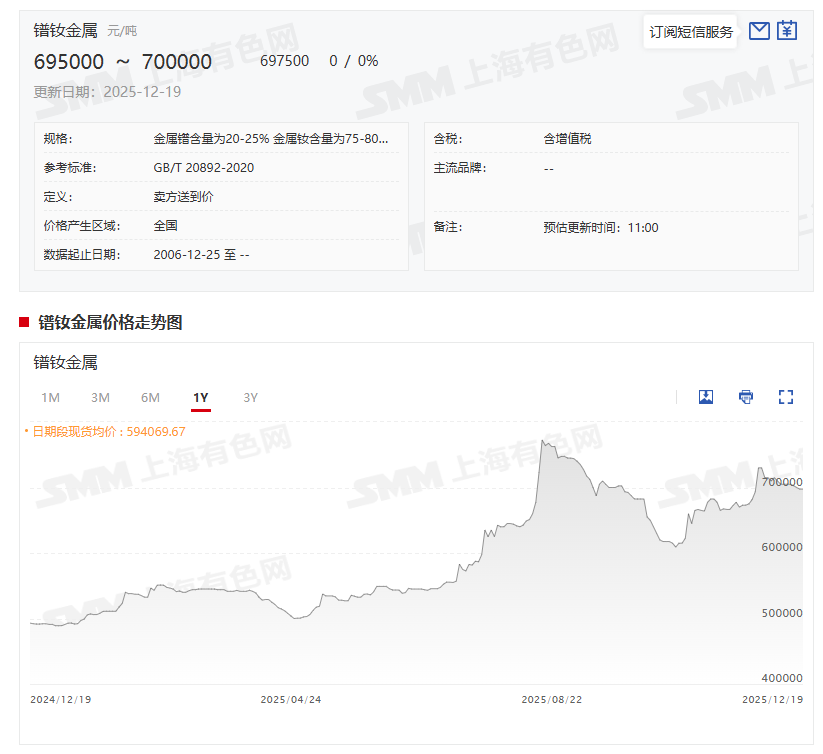 》点击查看SMM稀土现货价格 》订购查看SMM金属现货历史价格走势 据SMM最新的报价显示:12月19日,镨钕金属价格报695000~700000 元/吨,均价为697500元/吨,较前一交易日持平。 当前,稀土市场的整体价格趋势保持在弱势稳定的状态。具体表现为氧化物的价格相对疲软,而金属市场价格则维持平稳。镨钕市场方面,尽管金属市场的询单情况有所回暖,但这种回暖主要集中在大型金属企业,中小型金属企业的询单依旧冷清。由于成本倒挂以及询单量较少的原因,镨钕金属报价相对坚挺。在氧化物市场上,虽然询单活跃度有所提高,但由于金属企业的询单价格普遍偏低,部分现货持有者选择降价销售以促进成交,这导致了氧化物价格出现轻微下调。不过,鉴于市场上整体供应仍然紧张,实际的价格下调幅度并不大。整体来看,稀土市场价格整体呈现弱稳运行的态势:氧化物市场因询单价格普遍较低,持货商主动降价出货,导致价格走弱;金属市场则因成本倒挂及询单冷清,市场报价相对坚挺,价格整体平稳运行。预计短期内,在下游订单状况未见改善的情况下,稀土价格或将弱稳运行。 推荐阅读: 》稀土市场交投不佳 价格整体弱稳运行【SMM稀土日评】 |