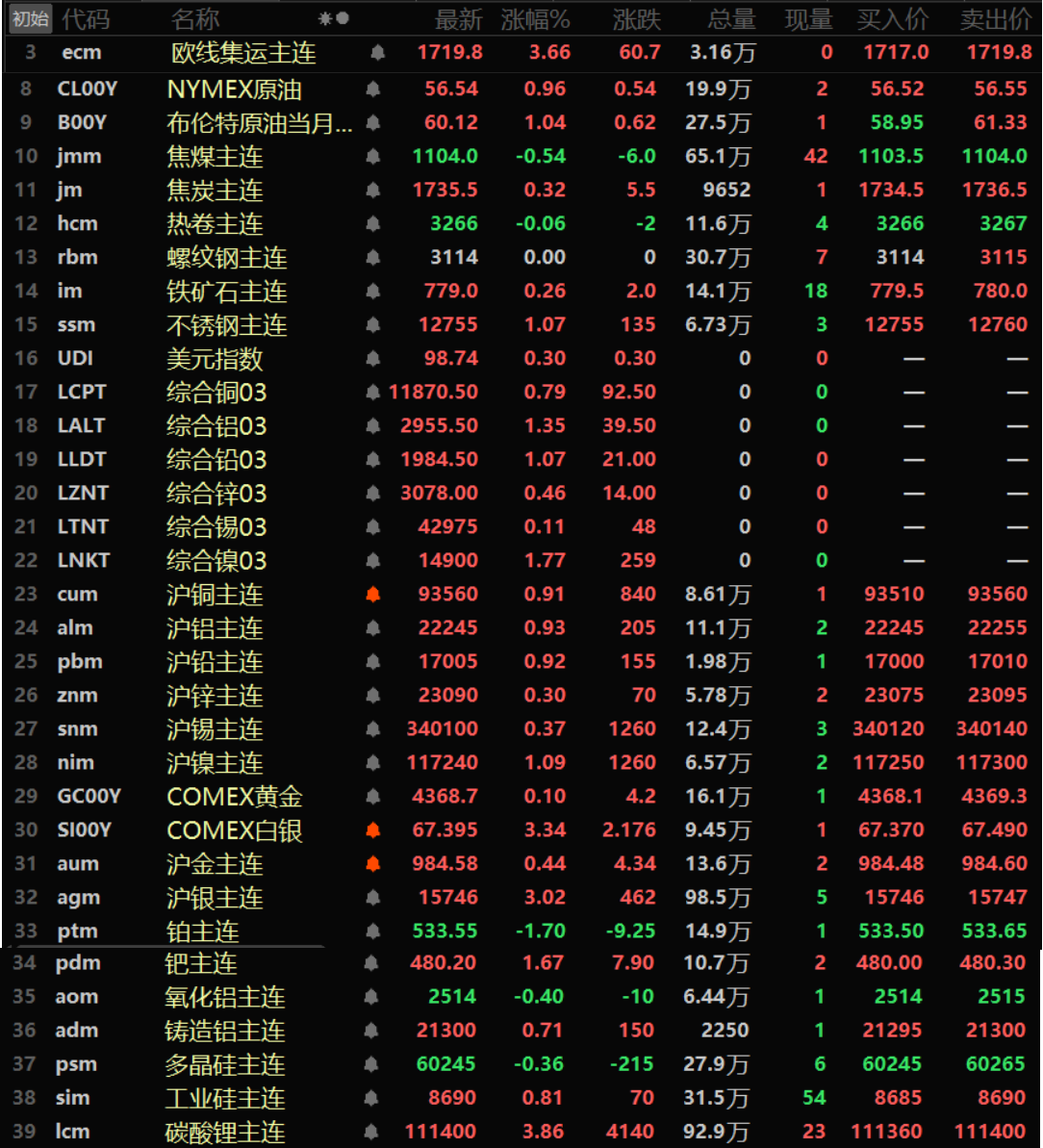 SMM12月20日讯: 金属市场方面: 隔夜内外盘金属集体上涨,伦铝、伦铅、伦镍以及沪镍一同涨逾1%,伦铝涨1.35%,伦铅涨1.07%,伦镍涨1.77%,沪镍涨1.09%,其余金属涨幅均在1%以内。氧化铝主连跌0.4%,铸造铝主连涨0.71%。 隔夜黑色系方面涨跌互现,不锈钢涨1.07%,铁矿涨0.26%,螺纹暂时持平于3114元/吨,热卷跌0.06%。双焦方面,焦煤跌0.54%,焦炭涨0.32%。 隔夜贵金属方面,COMEX黄金涨0.1%,周线上涨0.93%,录得连续第二个周的上涨;COMEX白银涨3.34%,盘中最高触及67.68美元/盎司,继续刷新其上市以来的历史新高,周线上涨8.69%,录得四周连涨。国内方面,沪金涨0.44%,周线上涨1.58%。沪银涨3.02%,盘中最高触及15769元/千克,同样继续刷新其上市以来的历史新高,周线上涨4.07%,同样录得连续第四个周的上涨。 截至12月20日8:25分周五隔夜收盘行情