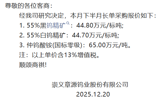 据崇义章源钨业12月20日消息:崇义章源钨业股份有限公司12月下半月的长单采购报价如下:1. 55%黑钨精矿:44.8元/标吨,较上轮报价上调9.8万元/标吨;2. 55%白钨精矿:44.7万元/标吨,较上轮报价上调9.8万元/标吨;3. 仲钨酸铵(国标零级):65万元/吨,较上轮报价上调14万元/吨。