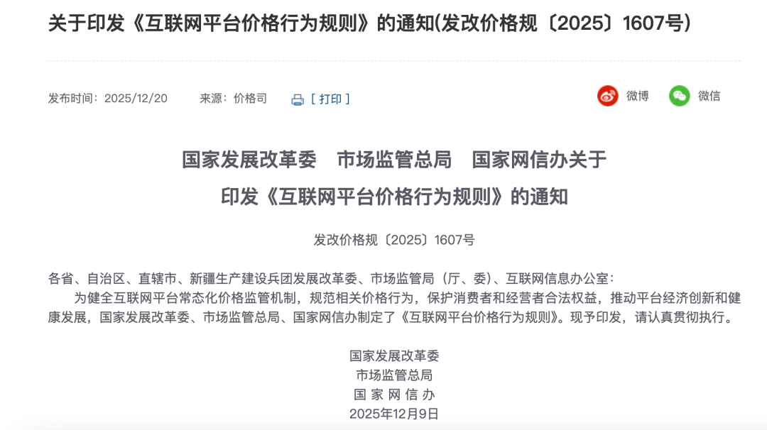 三部门发布《互联网平台价格行为规则》。 据国家发展改革委网站12月20日消息,为健全互联网平台常态化价格监管机制,规范相关价格行为,保护消费者和经营者合法权益,推动平台经济创新和健康发展,国家发展改革委、市场监管总局、国家网信办制定发布了《互联网平台价格行为规则》(以下简称《行为规则》)。