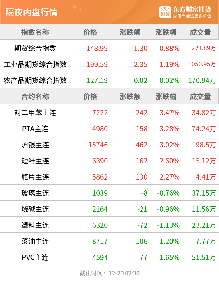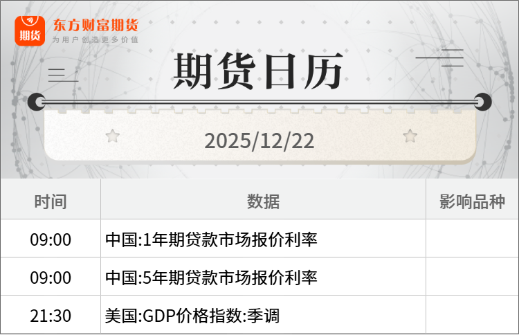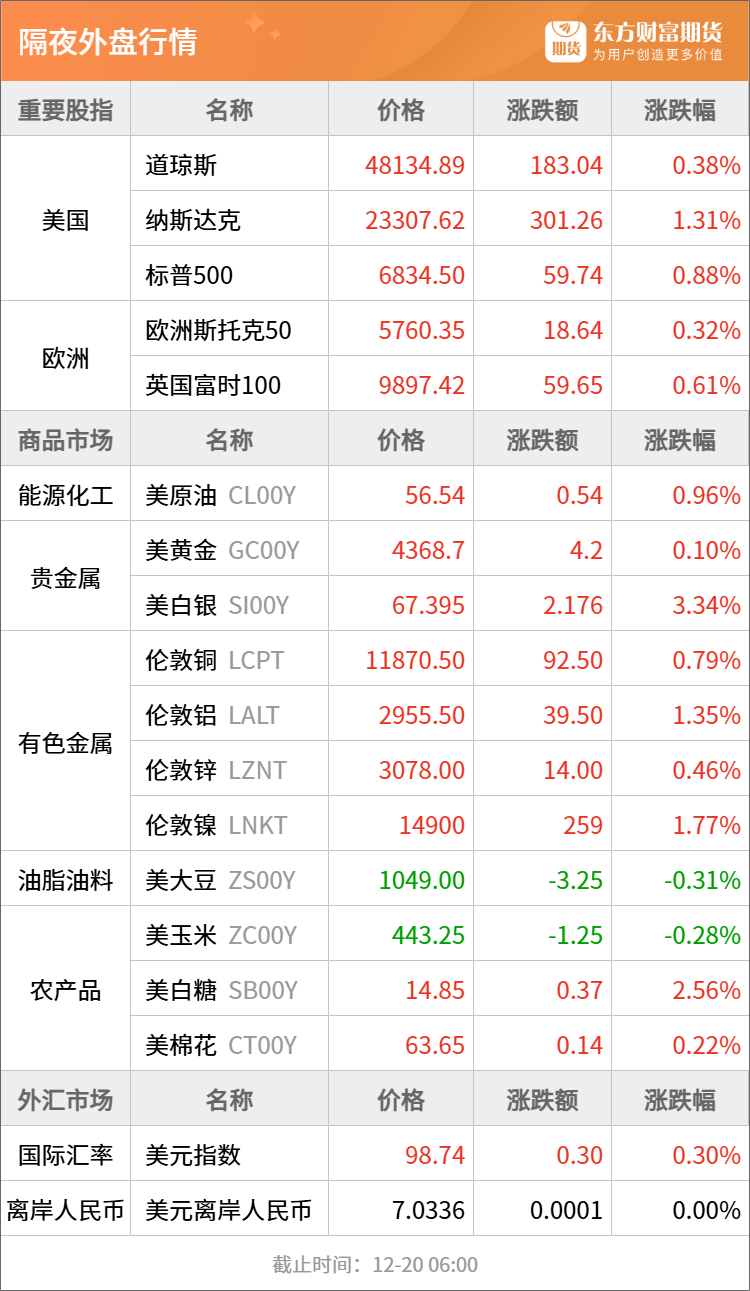 隔夜行情![]() ![]() 每日精选PX、PTA期货价格逆势大涨!核心驱动是什么? 泰军发动空袭!伊以局势生变!银价还要涨? 降息大消息!美联储重磅传来!下一任主席人选即将公布 宏观产经新华社:国务院总理李强12月19日主持召开国务院常务会议,深入学习贯彻习近平总书记在中央经济工作会议上的重要讲话精神,对贯彻落实中央经济工作会议决策部署作出安排。会议强调,国务院各部门要切实把思想和行动统一到党中央对形势的科学判断和决策部署上来,全面贯彻明年经济工作的总体要求和政策取向,进一步增强责任感、紧迫感,认真对标对表,主动认领任务,结合职能逐项细化实化,加快制定具体实施方案,推动各项工作落地见效。 新华社:《互联网平台价格行为规则》印发。平台内经营者在不同平台销售商品或者提供服务的,依法自主定价。平台经营者不得违反《中华人民共和国电子商务法》第三十五条规定,采取提高收费标准、增加收费项目、扣除保证金、削减补贴或者优惠、限制流量、搜索降序、算法降权、屏蔽店铺、下架商品或者服务等措施,对平台内经营者的价格行为进行不合理限制或者附加不合理条件。 商务部:印方相关措施涉嫌违反世贸组织约束税率、国民待遇等多项义务,并构成世贸组织明令禁止的进口替代补贴。这些措施给予印方本国产业不公平的竞争优势,损害了中方利益。这是中方继起诉印度电动汽车及电池补贴措施后,切实维护国内产业合法权益的又一坚定举措。我们再次敦促印方恪守其在世贸组织有关承诺,立即纠正错误做法。 品种资讯黑色系期货 钢材:在2026钢铁市场展望暨“我的钢铁”年会上,中国钢铁工业协会党委副书记、副会长姜维表示,钢铁库存控制要向2021年库存水平看齐。他表示,2021年行业形势向好,只要企业能把库存控制在当年水平,相信整个行业会迎来良好态势。(财联社) 冶金工业规划研究院19日在北京发布的2026年国内及全球钢材需求预测成果报告显示,2025年中国钢材消费量或为8.08亿吨,同比下降5.4%;2026年我国钢材需求量或为8亿吨,同比下降1.0%。从全球来看,上述报告预测,2025年全球钢材消费量为17.19亿吨,同比下降1.8%;2026年全球钢材需求量为17.36亿吨,同比增长1.0%。(第一财经) 铁矿石:本周(截至12月19日),全国47个港口进口铁矿库存总量16225.53万吨,环比增加114.06万吨;45个港口进口铁矿库存总量15512.63万吨,环比增加81.21万吨。(我的钢铁网) 焦煤:大商所发布公告,经研究决定,将焦煤期货河北省唐山市、天津市的指定交割仓库升贴水由170元/吨调整为140元/吨。上述调整自JM2701合约起实施。自JM2612合约最后交割日后第4个交易日起,我所将按照修改后的规定办理标准仓单注册。(第一财经) 农产品期货 生猪:本周(截至12月19日)国内生猪价格呈震荡上涨走势,周均价环比上涨。据中国养猪网的数据,12月19日,生猪(外三元)价格为11.71元/公斤,与上周五(12月12日)的11.45元/公斤相比,上涨2.3%。从一周均价来看,本周生猪均价为11.6元/公斤,与上周11.37元/公斤的均价相比,上涨2%。(澎湃新闻) 据农业农村部监测,2025年12月8-14日,生猪定点屠宰企业生猪平均收购价格为12.98元/公斤,环比上涨0.1%,同比下降25.9%。白条肉平均出厂价格为16.98元/公斤,环比与上期持平,同比下降25.5%。(界面新闻) 豆粕:据Mysteel,12月19日,全国主要油厂豆粕成交11.94万吨,较前一交易日减5.56万吨,其中现货成交8.56万吨,较前一交易日增4.08万吨,远月基差成交3.38万吨,较前一交易日减9.64万吨。当日全国动态全样本油厂开机率下降至56.04%。(我的钢铁网) 棉花:据Mysteel调研显示,截止至12月18日,进口棉主要港口库存周环比增加0.41%,总库存39.19万吨,其中,山东地区青岛、济南港口及周边仓32.9万吨,同比减少20.57%,江苏地区张家港港口及周边仓库进口棉库存约3.37万吨,其他港口库存约2.92万吨。本周少量巴西棉到港,库存增加放缓。(我的钢铁网) 有色/贵金属期货 沪金:12月20日,老凤祥黄金足金饰品报1362元/克,较昨日上涨6元/克;老庙黄金足金饰品报1361元/克,较昨日上涨5元/克;周生生足金饰品报1359元/克,较昨日上涨4元/克。(新华财经) 沪铜:美国商品期货交易委员会(CFTC)数据显示:截至12月9日当周,COMEX铜投机者净多头头寸增加6,879手至71,083手。(财联社) 高盛重申其2035年铜价将达15,000美元的预测,并继续建议采取做多铜、做空铝的交易策略;在其基准情景下,2026年铜价将企稳,均价将达每吨11,400美元。(财联社) 碳酸锂:自2025年12月23日交易时起,非期货公司会员或者客户在碳酸锂期货LC2602、LC2603、LC2604、LC2605合约上单日开仓量分别不得超过800手,在碳酸锂期货LC2606、LC2607、LC2608、LC2609、LC2610、LC2611、LC2612合约上单日开仓量分别不得超过2000手。(广期所) 沪镍:根据印尼政府为明年制定的工作计划和预算,2026年的镍矿产量目标约为2.5亿吨,较2025年3.79亿吨的目标低了近三分之一。在全球最大生产国可能收紧供应的预期下,伦敦金属交易所期镍价格连续第三个交易日上涨,持续从八个月低位反弹。(财联社) 能化期货 原油:乌克兰武装部队总参谋部20日发布消息称,乌国防军19日晚对隶属俄罗斯卢克石油公司的里海油气钻井平台发动袭击。乌武装部队总参谋部在社交媒体上发布消息称,乌军袭击了一座位于里海菲拉诺夫斯基油气田的油气钻井平台,该平台隶属俄罗斯卢克石油公司,该油气田生产的油气被